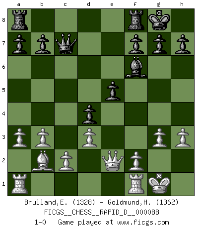 Last move : 1-0 2015 March 23 2:54:41 [Event "FICGS__CHESS__RAPID_D__000088"] [Site "FICGS"] [Date "2015.01.01"] [Round "1"] [White "Brulland,Emmanuel"] [Black "Goldmund,Heike"] [Result "1-0"] [WhiteElo "1328"] [BlackElo "1362"] 1.b3 d5 2.e3 Nf6 3.Bb2 c5 4.d3 Bg4 5.Be2 Bxe2 6.Qxe2 e6 7.Nf3 Be7 8.Nc3 Qc7 9.O-O O-O 10.a3 Nc6 11.h3 d4 12.exd4 Nxd4 13.Nxd4 cxd4 14.Ne4 e5 15.Nxf6+ Bxf6 16.g3 1-0 This chess game has been lost on time (started : 2015.01.01 12:25:30) Nimzovich-Larsen attack : Classical variation Kingside Castling by player White (move 9) Kingside Castling by player Black (move 9) Player White won this chess game. Follow this game move after move (download)Chess is a fighting game which is purely intellectual and includes chance. (Richard Reti) Alles was ich jemals tun will ist Schach spielen. (Robert James Fischer) Te sientas frente a un tablero y repentinamente tu corazón brinca. Tu mano tiembla al tomar una pieza y moverla. Pero lo que el Ajedrez te enseña es que tu debes permanecer ahí con calma y pensar de que si realmente es una buena idea o de que si hay otras ideas mejores. (Stanley Kubrick) Le système Elo représente seulement une moyenne. Il est simplement un indicateur de votre stabilité. (Anatoli Karpov) Life is the sum of all your choices. (Albert Camus)