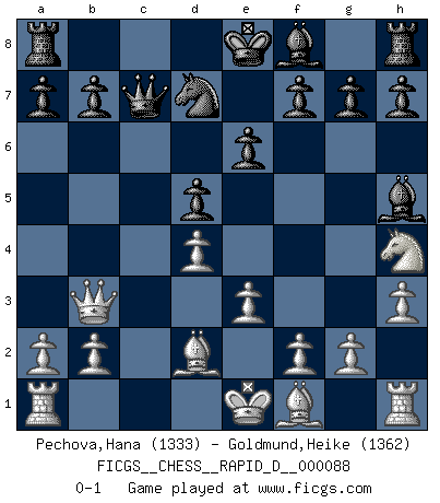 Last move : 0-1 2015 April 20 13:28:30 [Event "FICGS__CHESS__RAPID_D__000088"] [Site "FICGS"] [Date "2015.01.01"] [Round "1"] [White "Pechova,Hana"] [Black "Goldmund,Heike"] [Result "0-1"] [WhiteElo "1333"] [BlackElo "1362"] 1.c4 c6 2.d4 d5 3.Nf3 Nf6 4.Nc3 Bf5 5.e3 e6 6.Nh4 Bg4 7.Qb3 Qc7 8.h3 Bh5 9.Bd2 Nbd7 10.cxd5 Nxd5 11.Nxd5 cxd5 0-1 English : Caro-Kann defensive system Player Black won this chess game. Follow this game move after move (download)Chess books should be used as we use glasses: to assist the sight, although some players make use of them as if they thought they conferred sight. (Jose Raul Capablanca) Wie bekannt hörte Morphy 1859 auf, Schach zu spielen. Seine Enttäuschung galt nicht so sehr dem Schach, wie den Schachspielern. (Robert James Fischer) Bobby solo arroja las piezas y solas caen en las casillas correctas. (Miguel Najdorf ) 'L'échange des dames est un coup dur pour les deux adversaires...' Un journaliste lors d'une partie du match Spassky-Fischer It's only after you lost everything, Tyler says, that you're free to do anything. (Chuck Palahniuk, Fight Club)