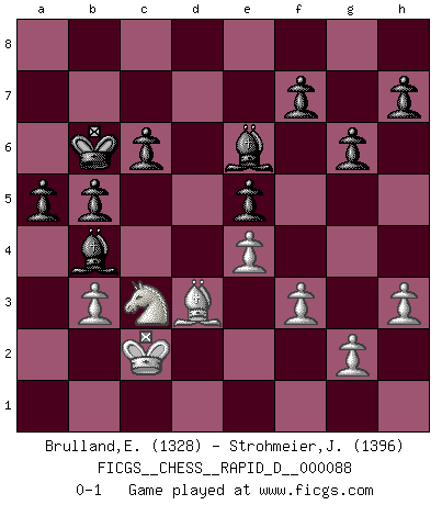 Last move : 0-1 2015 May 9 9:39:22 [Event "FICGS__CHESS__RAPID_D__000088"] [Site "FICGS"] [Date "2015.01.01"] [Round "1"] [White "Brulland,Emmanuel"] [Black "Strohmeier,Josef"] [Result "0-1"] [WhiteElo "1328"] [BlackElo "1396"] 1.c4 Nf6 2.Nc3 g6 3.d4 Bg7 4.e4 d6 5.h3 e5 6.dxe5 dxe5 7.Qxd8+ Kxd8 8.Bg5 c6 9.Nf3 Re8 10.O-O-O Kc7 11.Be2 Nbd7 12.Bxf6 Nxf6 13.Nd2 Be6 14.f3 Bh6 15.Kc2 Rad8 16.Nb3 b6 17.Rxd8 Rxd8 18.Rd1 Rxd1 19.Bxd1 Bxc4 20.Nd2 Be6 21.a3 a5 22.Be2 Nd7 23.Nb3 Be3 24.Nd1 Bg1 25.Nc3 Nc5 26.Nxc5 Bxc5 27.Bf1 Be7 28.b3 Bxa3 29.Nb1 Bb4 30.Bd3 b5 31.Nc3 Kb6 0-1 This chess game has been lost on time (started : 2015.01.01 12:25:30) English Opening Queenside Castling by player White (move 10) Player Black won this chess game. Follow this game move after move (download)Do you realize Fischer almost never has any bad pieces? He exchanges them, and the bad pieces remain with his opponents. (Yuri Balashov) Er war ein guter Schachspieler, aber ich kann Leute nicht ausstehen, die 'Heil Hitler' rufen (Über Alexander Aljechin). (Miguel Najdorf) El Ajedrez es 99 por ciento táctica. (Teichmann) Votre prénom est 'Tactique', votre deuxième prénom est 'Tactique' et votre nom est 'Tactique'. (Ken Smith) Everybody lies. (Gregory House, House M.D.)