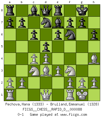 Last move : 0-1 2015 March 30 4:38:11 [Event "FICGS__CHESS__RAPID_D__000088"] [Site "FICGS"] [Date "2015.01.01"] [Round "1"] [White "Pechova,Hana"] [Black "Brulland,Emmanuel"] [Result "0-1"] [WhiteElo "1333"] [BlackElo "1328"] 1.d4 d5 2.c4 c6 3.Nf3 Nf6 4.Nc3 e6 5.Bg5 Be7 6.e3 Nbd7 7.Bd3 h6 8.Bh4 O-O 9.O-O Re8 0-1 This chess game has been lost on time (started : 2015.01.01 12:25:30) QGD Slav : 4.Nc3 Kingside Castling by player Black (move 8) Kingside Castling by player White (move 9) Player Black won this chess game. Follow this game move after move (download)Chess is like war on a board. (Bobby Fischer) Zeige mir drei Eröffnungsvarianten und ich beweise dir, dass zwei davon inkorrekt sind. (Emanuel Lasker) El Ajedrez es realmente noventa y nueve por ciento calculación. (Soltis) Des combinaisons [dans le jeu d'échecs] pareilles à des mélodies. Je crois entendre pour ainsi dire la musique des coups... (Vladimir Nabokov) Gambling : The sure way of getting nothing from something. (Wilson Mizner)