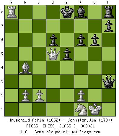 Last move : 1-0 2007 April 4 23:28:48 [Event "FICGS__CHESS__CLASS_C__000031"] [Site "FICGS"] [Date "2007.02.27"] [Round "1"] [White "Hauschild,Achim"] [Black "Johnston,Jim"] [Result "1-0"] [WhiteElo "1652"] [BlackElo "1700"] 1.e4 c5 2.Nf3 d6 3.d4 cxd4 4.Nxd4 Nf6 5.Nc3 a6 6.g3 e5 7.Nde2 b5 8.Bg2 Bb7 9.a3 Be7 10.O-O Nbd7 11.g4 Nxg4 12.Ng3 Ndf6 13.Nf5 Bf8 14.Qe2 g6 15.Ng3 Qc7 16.Qf3 Qe7 17.h3 Nh6 18.Rd1 Rd8 19.Be3 Nhg8 20.Rd3 Nd7 21.Rad1 Qe6 22.a4 bxa4 23.Nxa4 Rc8 24.Rb3 Rc7 25.Bd2 Bc6 26.Nb6 Nxb6 27.Rxb6 Bb5 28.Bb4 Rd7 29.Rb8+ Rd8 30.Rxd8+ Kxd8 31.Qa3 Kd7 32.Bf1 Bxf1 33.Nxf1 Nf6 34.Qxa6 Nxe4 35.Qb7+ Ke8 36.Ra1 Qd7 37.Qxe4 f6 38.Qd5 Qxh3 39.Ra8+ 1-0 Sicilian : Najdorf, Zagreb (Fianchetto) variation Kingside Castling by player White (move 10) Player White won this chess game. Follow this game move after move (download)No Chess Grandmaster is normal; they only differ in the extent of their madness. (Viktor Korchnoi) Kostenjuk hat keinen Sexappeal. (Loek van Wely) El Ajedrez es realmente noventa y nueve por ciento calculación. (Soltis) Je fais ceci parce que dans cinquante coups j'obtiendrai cela; je m'appelle Mikhail Moisevitch Botvinnik. (Botvinnik) The meaning of life is that it is to be lived, and it is not to be traded and conceptualized and squeezed into a pattern of systems. (Bruce Lee)
