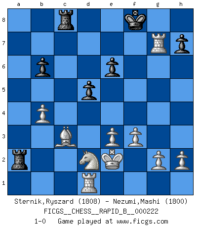 Last move : 1-0 2015 March 14 1:24:5 [Event "FICGS__CHESS__RAPID_B__000222"] [Site "FICGS"] [Date "2015.01.02"] [Round "1"] [White "Sternik,Ryszard"] [Black "Nezumi,Mashi"] [Result "1-0"] [WhiteElo "1808"] [BlackElo "1800"] 1.b4 Nf6 2.Bb2 b6 3.e3 Bb7 4.Nf3 a6 5.a3 Nc6 6.d4 b5 7.c4 bxc4 8.Bxc4 d5 9.Bb3 e6 10.Ba4 Bd6 11.Qc2 O-O 12.Bxc6 Bxc6 13.Qxc6 Qb8 14.Ne5 Qb6 15.Nd2 Bxe5 16.Qxb6 cxb6 17.dxe5 Nd7 18.Rc1 a5 19.Rc7 Rfd8 20.Ke2 axb4 21.axb4 Ra2 22.Bd4 f6 23.exf6 Nxf6 24.Re7 Ne4 25.Rxg7+ Kf8 26.Rd1 Rc8 27.f3 Nc3+ 28.Bxc3 1-0 This chess game has been lost on time (started : 2015.01.02 5:46:42) Polish (Sokolsky) opening Kingside Castling by player Black (move 11) Player White won this chess game. Follow this game move after move (download)After a bad opening, there is hope for the middle game. After a bad middle game, there is hope for the endgame. But once you are in the endgame, the moment of truth has arrived. (Edmar Mednis) Gewinnen beim Schach fördert das Selbstvertrauen. Beim Sex spüre ich sowas nicht... (Garry Kasparov) Tu puedes aprender mucho mas de una partida que pierdas que de una partida ganada. Tendras que perder cientos de partidas antes de llegar a ser un buen jugador. (Jose Raul Capablanca) Les erreurs sont comme les malheurs, elles n'arrivent jamais seules. (Siegbert Tarrasch) A computer lets you make more mistakes faster than any invention in human history - with the possible exceptions of handguns and tequila. (Mitch Ratcliffe)