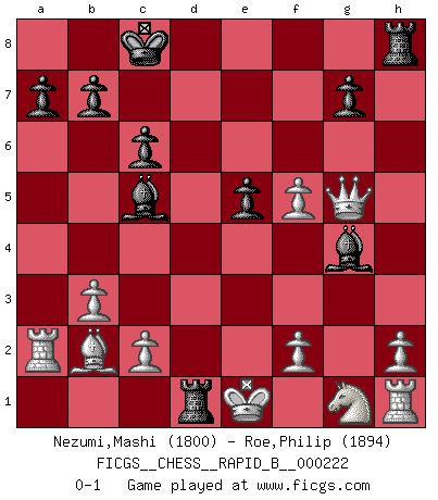 Last move : 0-1 2015 January 16 20:59:14 [Event "FICGS__CHESS__RAPID_B__000222"] [Site "FICGS"] [Date "2015.01.02"] [Round "1"] [White "Nezumi,Mashi"] [Black "Roe,Philip"] [Result "0-1"] [WhiteElo "1800"] [BlackElo "1894"] 1.g4 d5 2.Bg2 c6 3.g5 h6 4.d3 hxg5 5.Bxg5 Qb6 6.Bc1 Nf6 7.e4 Bg4 8.Qd2 dxe4 9.Bxe4 Nxe4 10.dxe4 e5 11.Nc3 Nd7 12.Na4 Qa6 13.b3 O-O-O 14.Bb2 Nc5 15.Nxc5 Bxc5 16.Qg5 f5 17.exf5 Qxa2 18.Rxa2 Rd1+ 0-1 Grob : Spike attack Queenside Castling by player Black (move 13) Player Black won this chess game. Follow this game move after move (download)The most powerful weapon in Chess is to have the next move. (David Bronstein) Warum muß ich gegen diesen IDIOTEN verlieren? (Aaron Nimzowitsch) El Ajedrez moderno está demasiado preocupado con cosas como la estructura de Peones. Olvidenlo, el Jaque Mate termina la partida. (Nigel Short) Que feriez-vous si vous étiez en train de jouer aux échecs et que la fin du monde arrive ? Je continuerais à jouer. (Saint Borromée) Depression is just anger without enthusiasm. (Unknown)