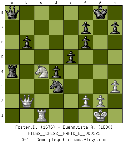 Last move : 0-1 2015 March 5 15:49:28 [Event "FICGS__CHESS__RAPID_B__000222"] [Site "FICGS"] [Date "2015.01.02"] [Round "1"] [White "Foster,Duncan"] [Black "Buenavista,Anthony"] [Result "0-1"] [WhiteElo "1676"] [BlackElo "1800"] 1.e4 d5 2.exd5 Qxd5 3.Nc3 Qd6 4.d4 Nf6 5.Bc4 c6 6.Nge2 Bf5 7.Bf4 Qb4 8.Bb3 e6 9.O-O Nbd7 10.Re1 Be7 11.Bc7 Bd8 12.a3 Qe7 13.Bxd8 Qxd8 14.Ng3 Bg6 15.Qf3 O-O 16.Rad1 a5 17.a4 Qb6 18.Nce4 Qb4 19.Nc3 c5 20.Na2 Qb6 21.Nc3 cxd4 22.Nb5 e5 23.Nf5 Rae8 24.h3 Nc5 25.Nfd6 Nxb3 26.Nxe8 Bxc2 27.Nxf6+ gxf6 28.Rd3 Bxd3 29.Qxd3 Nc5 30.Qa3 Qc6 31.Rc1 b6 32.b4 axb4 33.Qxb4 Ra8 34.Na3 Rxa4 35.Qb2 Qa8 36.Nc4 Nd3 0-1 Scandinavian : Pytel-Wade variation Kingside Castling by player White (move 9) Kingside Castling by player Black (move 15) Player Black won this chess game. Follow this game move after move (download)An attack on the wing should be met by play in the center. (Nimzovitch) Der Schachmeister von Heute braucht Courage, einen Killerinstinkt, Ausdauer und Arroganz. (Larry Evans) Muchos jugadores de Ajedrez se sorprendían cuando después de la partida, Fischer explicaba con calma: 'Yo ya había analizado esta posibilidad' en una posición en la cual yo creía que no era posible de prever desde la apertura. (Mikhail Tal) RxDa4 pat (...) There are two types of people in this world, good and bad. The good sleep better, but the bad seem to enjoy the waking hours much more. (Woody Allen)