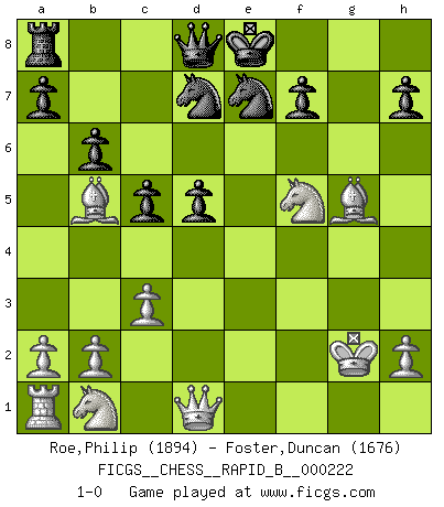 Last move : 1-0 2015 January 7 16:22:37 [Event "FICGS__CHESS__RAPID_B__000222"] [Site "FICGS"] [Date "2015.01.02"] [Round "1"] [White "Roe,Philip"] [Black "Foster,Duncan"] [Result "1-0"] [WhiteElo "1894"] [BlackElo "1676"] 1.e4 e6 2.d4 b6 3.Bd3 Bb7 4.Ne2 g6 5.O-O Bg7 6.f4 Ne7 7.f5 exf5 8.exf5 gxf5 9.c3 Rg8 10.Rf2 Bxg2 11.Rxg2 Bxd4+ 12.Nxd4 Rxg2+ 13.Kxg2 d5 14.Bg5 c5 15.Bb5+ Nd7 16.Nxf5 1-0 French defense Kingside Castling by player White (move 5) Player White won this chess game. Follow this game move after move (download)Chess is above all, a fight ! (Emanuel Lasker) Ein bischen Romantik kann weder im Schach noch in der Liebe schaden. Also versuche ich mich ab und zu daran zu erinnern. (Nigel Short) Antes de los Finales, los dioses han colocado el Juego Medio. (Siegbert Tarrasch) Le profane ne songe pas à la somme de jouissance dont il se prive, qui méconnaît ce jeu aux ressources aussi variées que passionnantes. (Jean-Marie Jeanton-Lamarche) Never was anything great achieved without danger. (Niccolo Machiavelli)