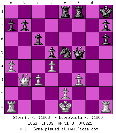 Last move : 0-1 2015 February 15 14:24:39 [Event "FICGS__CHESS__RAPID_B__000222"] [Site "FICGS"] [Date "2015.01.02"] [Round "1"] [White "Sternik,Ryszard"] [Black "Buenavista,Anthony"] [Result "0-1"] [WhiteElo "1808"] [BlackElo "1800"] 1.b4 e5 2.Bb2 Bxb4 3.Bxe5 Nf6 4.Nc3 Ba5 5.Nf3 d6 6.Bxf6 Qxf6 7.Nd5 Qh6 8.g3 c6 9.Ne3 O-O 10.Bg2 f5 11.c3 Nd7 12.Qb3+ Kh8 13.h4 d5 14.d4 f4 15.gxf4 Qxf4 16.h5 Bc7 17.Bh3 Nb6 18.a4 Bxh3 19.Rxh3 Rae8 20.Rh4 Qh6 21.Ng4 Qe6 22.Nfe5 Qf5 23.f3 Bxe5 24.Nxe5 Nc4 25.h6 gxh6 26.Rh1 Nxe5 0-1 Polish (Sokolsky) opening Kingside Castling by player Black (move 9) Player Black won this chess game. Follow this game move after move (download)Many have become Chess Masters, no one has become the Master of Chess. (Siegbert Tarrasch) Ein Isolani verdüstert die Stimmung auf dem ganzen Schachbrett. (Savielly Grigorievitsch Tartakower) No hay un Gran Maestro de Ajedrez que sea normal; solo se diferencían ellos por la magnitud de su locura. (Viktor Korchnoi) Dans le domaine de la peinture, de la gravure et de la sculpture, dès la première décennie de notre siècle, les artistes abandonnent la représentation de la partie d'échecs pour se concentrer sur les pièces, sur les échiquiers et sur toutes les variations auxquelles les unes et les autres peuvent donner lieu. On passe en quelque sorte d'un thème social à un thème musical (au sens de la musica médiévale, c'est-à-dire d'une notion qui inclue le rythme, l'harmonie, la construction et la déconstruction, etc.). Graphiquement et picturalement, l'échiquier apparaît comme une structure ouverte, dynamique, d'une richesse infinie, autorisant toutes les combinatoires et débouchant sur des mouvements et des rythmes de nature exponentielle. (Michel Pastoureau) Those parts of the system that you can hit with a hammer (not advised) are called hardware; those program instructions that you can only curse at are called software. (Anonymous)