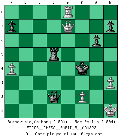 Last move : 1-0 2015 April 2 5:14:43 [Event "FICGS__CHESS__RAPID_B__000222"] [Site "FICGS"] [Date "2015.01.02"] [Round "1"] [White "Buenavista,Anthony"] [Black "Roe,Philip"] [Result "1-0"] [WhiteElo "1800"] [BlackElo "1894"] 1.e4 c5 2.Nf3 e6 3.d4 cxd4 4.Qxd4 Nc6 5.Qd3 Nf6 6.Nc3 Qb6 7.h3 d5 8.exd5 exd5 9.Be2 Be6 10.O-O O-O-O 11.a3 d4 12.Ne4 Nxe4 13.Qxe4 Bd6 14.Bf4 Bxf4 15.Qxf4 Qxb2 16.Rfb1 Qc3 17.Ng5 d3 18.Bxd3 Rd7 19.Nxe6 fxe6 20.Qe3 Nd4 21.Ra2 Rhd8 22.Rab2 g6 23.a4 Rc7 24.Kh1 Qa5 25.c3 Qxc3 26.Rxb7 Rxb7 27.Rxb7 Nf3 28.Rb1 Rxd3 29.Qxe6+ Kc7 30.Qf7+ Kd6 31.gxf3 Rxf3 32.Rd1+ Rd3 33.Qf4+ Kd5 34.Rc1 Qd2 35.Qf7+ Kd6 36.Qf6+ Kd5 37.Qc6+ Ke5 38.Rc5+ Rd5 39.Qe8+ Kf6 40.Rc7 Kg5 41.Qe7+ Kf5 42.Rc8 Kf4 43.Re8 1-0 Sicilian defense Kingside Castling by player White (move 10) Queenside Castling by player Black (move 10) Player White won this chess game. Follow this game move after move (download)Chess, like love, is infectious at any age. (Flohr) Kostenjuk hat keinen Sexappeal. (Loek van Wely) Solo existe una cosa que Fischer hace en el Ajedrez sin placer: ¡perder!. (Boris Spassky) Je fais ceci parce que dans cinquante coups j'obtiendrai cela; je m'appelle Mikhail Moisevitch Botvinnik. (Botvinnik) Programming can only do so much before it becomes too much. (Don Groves)