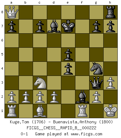 Last move : 0-1 2015 January 16 9:47:21 [Event "FICGS__CHESS__RAPID_B__000222"] [Site "FICGS"] [Date "2015.01.02"] [Round "1"] [White "Kuge,Tom"] [Black "Buenavista,Anthony"] [Result "0-1"] [WhiteElo "1706"] [BlackElo "1800"] 1.e4 d5 2.Nf3 dxe4 3.Ng5 e5 4.Nxe4 f5 5.Bc4 Qh4 6.Nbc3 fxe4 7.O-O Nc6 8.Bd5 Nf6 9.Bxc6+ bxc6 10.Qe2 Bc5 11.Qc4 Ng4 12.h3 Bxf2+ 13.Kh1 Qg3 14.Qxc6+ Bd7 15.Qxa8+ Ke7 0-1 Scandinavian (centre counter) defense Kingside Castling by player White (move 7) Player Black won this chess game. Follow this game move after move (download)Chess is everything: art, science and sport. (Anatoly Karpov) Ich spiele ehrlich und spiele, um zu gewinnen. Wenn ich verliere nehme ich meine Medizin. (Robert James Fischer) En el tablero, la mentira e hipocresía no sobreviven mucho. (Emanuel Lasker) On entre au jeu d'Echecs comme on entre en Religion. Pour le joueur d'Echecs, la partie d'Echecs c'est l'office, la messe, le défilé du 1er Mai, le dépôt de gerbe au Monument aux Morts. C'est un drame sacré. (Michel Roos) The problem with troubleshooting is that trouble shoots back. (Anonymous)