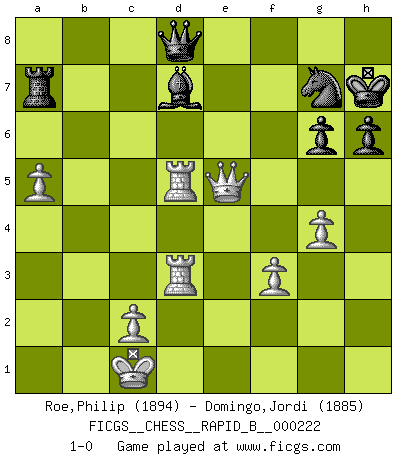 Last move : 1-0 2015 March 31 20:57:19 [Event "FICGS__CHESS__RAPID_B__000222"] [Site "FICGS"] [Date "2015.01.02"] [Round "1"] [White "Roe,Philip"] [Black "Domingo,Jordi"] [Result "1-0"] [WhiteElo "1894"] [BlackElo "1885"] 1.e4 e5 2.Nf3 d6 3.d4 exd4 4.Nxd4 g6 5.Nc3 Bg7 6.Be3 Nf6 7.Qd2 O-O 8.O-O-O Nc6 9.f3 Nxd4 10.Bxd4 Be6 11.g4 c5 12.Be3 Qa5 13.Bh6 Bxh6 14.Qxh6 b5 15.Bxb5 Rab8 16.h4 Rxb5 17.Nxb5 Qxb5 18.h5 Rb8 19.b3 Qd7 20.e5 Ne8 21.exd6 c4 22.Rhe1 Rc8 23.hxg6 fxg6 24.Qg5 Ng7 25.Re3 Rc6 26.Qe5 cxb3 27.axb3 a5 28.Rd2 h6 29.Red3 a4 30.bxa4 Ra6 31.a5 Kh7 32.Rd4 Qd8 33.Ra4 Qb8 34.Rd3 Qd8 35.d7 Ra7 36.Rad4 Bxd7 37.Rd5 1-0 Philidor : Larsen variation Kingside Castling by player Black (move 7) Queenside Castling by player White (move 8) Player White won this chess game. Follow this game move after move (download)There are two classes of men; those who are content to yield to circumstances and who play whist; those who aim to control circumstances, and who play Chess. (Mortimer Collins) Fischer machte Schach einfach zu einer aufregenden Sache, wann immer er sich ans Brett setzte. (Raymond Keene) Todos los Maestros de Ajedrez fueron un día unos principiantes. (Chernev) Les Echecs ne sont pas pour les âmes timides. Ils requièrent un homme entier, qui ne s'arrête pas aveuglément à ce qui a été déjà établi, mais qui tente individuellement de sonder les profondeurs du jeu. (W. Steinitz) Thibault, I ask for draw. Game 13876. - Sorry Ilmars, you won. (FICGS chat)