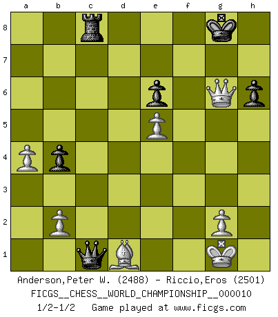 Last move : 1/2-1/2 2015 March 15 8:51:29 [Event "FICGS__CHESS__WORLD_CHAMPIONSHIP__000010"] [Site "FICGS"] [Date "2015.01.04"] [Round "6"] [White "Anderson,Peter W."] [Black "Riccio,Eros"] [Result "1/2-1/2"] [WhiteElo "2488"] [BlackElo "2501"] 1.d4 d5 2.c4 c6 3.Nf3 Nf6 4.Nc3 e6 5.Bg5 h6 6.Bh4 dxc4 7.e4 g5 8.Bg3 b5 9.Be2 Bb7 10.h4 g4 11.Ne5 Nbd7 12.Nxd7 Qxd7 13.Be5 Qd8 14.a4 b4 15.Nb1 c5 16.Bxc4 Bg7 17.Bb5+ Kf8 18.Nd2 cxd4 19.Rc1 Rc8 20.O-O Rxc1 21.Qxc1 Kg8 22.Re1 Nh5 23.Bxg7 Kxg7 24.Qc5 Qxh4 25.Qxa7 Rd8 26.Qxb7 g3 27.fxg3 Qxg3 28.Re2 Nf4 29.Nf3 Nxe2+ 30.Bxe2 d3 31.Bd1 Qd6 32.Qb5 Rc8 33.e5 Qc7 34.Qxd3 Qc1 35.Nd4 Kg8 36.Nxe6 fxe6 37.Qg6+ 1/2-1/2 QGD Slav : 4.Nc3 Kingside Castling by player White (move 20) This chess game ended in a draw. Follow this game move after move (download)Some part of a mistake is always correct. (Savielly Tartakover) Der Traum, für den ich lebe, ist der von einem freien Russland. Viele mögen sagen: Russland hat doch ein Parlament, einen gewählten Präsidenten. Aber ich spüre, dass in meiner Heimat die Angst wiederkehrt. Eine Angst, sich frei zu äußern, bestimmte Dinge zu tun (Garry Kasparov) En el Ajedrez, cuando menos, el valiente hereda la tierra. (Edmar Mednis) RxDa4 pat (...) Animated gif is worth one mega-word. (Unknown)