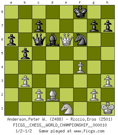 Last move : 1/2-1/2 2015 March 7 12:8:0 [Event "FICGS__CHESS__WORLD_CHAMPIONSHIP__000010"] [Site "FICGS"] [Date "2015.01.04"] [Round "12"] [White "Anderson,Peter W."] [Black "Riccio,Eros"] [Result "1/2-1/2"] [WhiteElo "2488"] [BlackElo "2501"] 1.e4 e5 2.Nf3 Nc6 3.Bb5 a6 4.Ba4 Nf6 5.O-O Be7 6.Re1 b5 7.Bb3 O-O 8.h3 Bb7 9.d3 d5 10.exd5 Nxd5 11.a4 Nd4 12.Nbd2 Nxb3 13.Nxb3 f6 14.Na5 Qc8 15.Bd2 Nb6 16.Nxb7 Qxb7 17.Qe2 Nxa4 18.d4 Bd6 19.b3 Nb6 20.dxe5 fxe5 21.Nxe5 Rae8 22.f4 Qa8 23.Qg4 Qd5 24.Nd3 Qc6 25.Rxe8 Rxe8 26.Re1 Rxe1+ 27.Nxe1 Nd7 28.Qe6+ Kf8 29.Kh1 Nf6 1/2-1/2 Ruy Lopez : Closed, 7...O-O Kingside Castling by player White (move 5) Kingside Castling by player Black (move 7) This chess game ended in a draw. Follow this game move after move (download)In Fischer's hands, a slight theoretical advantage is as good a being a Queen ahead. (Isaac Kashdan) Irgendwie scheint mir sonntags früh um 9 Uhr der Killerinstinkt verloren gegangen zu sein. (Alexej Shirov) Un jugador que es sorprendido, esta derrotado a medias. (Proverbio) Il vaut toujours mieux jouer un plan faux de façon logique que de n'avoir pas de plan du tout. (Victor Kortchnoï) When it is a question of money, everybody is of the same religion. (Voltaire)