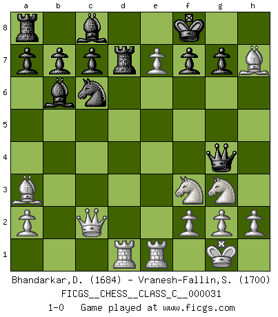 Last move : 1-0 2007 March 21 3:0:25 [Event "FICGS__CHESS__CLASS_C__000031"] [Site "FICGS"] [Date "2007.02.27"] [Round "1"] [White "Bhandarkar,Dinesh"] [Black "Vranesh-Fallin,Scott"] [Result "1-0"] [WhiteElo "1684"] [BlackElo "1700"] 1.e4 e5 2.Nf3 Nc6 3.Bc4 Bc5 4.b4 Bxb4 5.c3 Ba5 6.d4 exd4 7.O-O dxc3 8.Qb3 Qf6 9.e5 Qg6 10.Nxc3 Nge7 11.Ba3 O-O 12.Rad1 Bb6 13.Bd3 Qg4 14.Qc2 Qh5 15.Ne4 Rd8 16.Ng3 Qg4 17.Bxh7+ Kf8 18.Rfe1 d5 19.exd6 Rd7 20.dxe7+ 1-0 Evans gambit : compromised defense Kingside Castling by player White (move 7) Kingside Castling by player Black (move 11) Player White won this chess game. Follow this game move after move (download)Combinations have always been the most intriguing aspect of Chess. The masters look for them, the public applauds them, the critics praise them. It is because combinations are possible that Chess is more than a lifeless mathematical exercise. They are the poetry of the game; they are to Chess what melody is to music. They represent the triumph of mind over matter. (Reuben Fine) Fischer machte Schach einfach zu einer aufregenden Sache, wann immer er sich ans Brett setzte. (Raymond Keene) Uno no tiene que jugar muy bien, es suficiente jugar mejor que el oponente. (Siegbert Tarrasch) Les Echecs ne sont pas pour les âmes timides. Ils requièrent un homme entier, qui ne s'arrête pas aveuglément à ce qui a été déjà établi, mais qui tente individuellement de sonder les profondeurs du jeu. (W. Steinitz) I believe in luck. How else can you explain the success of those you dislike ? (Jean Cocteau)
