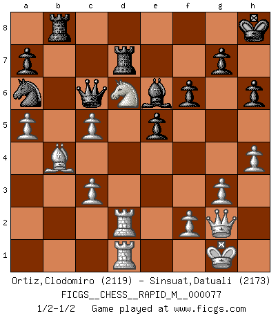 Last move : 1/2-1/2 2015 March 17 13:7:25 [Event "FICGS__CHESS__RAPID_M__000077"] [Site "FICGS"] [Date "2015.01.04"] [Round "1"] [White "Ortiz,Clodomiro"] [Black "Sinsuat,Datuali"] [Result "1/2-1/2"] [WhiteElo "2119"] [BlackElo "2173"] 1.d4 Nf6 2.c4 e6 3.Nc3 Bb4 4.Qc2 O-O 5.Nf3 c5 6.dxc5 Na6 7.g3 Nxc5 8.Bg2 Nce4 9.O-O Nxc3 10.bxc3 Be7 11.e4 d6 12.e5 dxe5 13.Nxe5 Qc7 14.Qe2 Bd6 15.Re1 Ne8 16.a4 f6 17.Nf3 e5 18.Be3 Be6 19.Nd2 Bc5 20.Bxb7 Qxb7 21.Bxc5 Rf7 22.Ba3 h6 23.c5 Bd5 24.Nc4 Rd8 25.Bb4 Bf3 26.Qf1 Qc6 27.Re3 Rfd7 28.Nd6 Nc7 29.h4 Kh8 30.Rd3 Bd5 31.Rd2 Rb8 32.a5 Be6 33.Rad1 Na6 34.Qg2 1/2-1/2 Nimzo-Indian : Classical variation Kingside Castling by player Black (move 4) Kingside Castling by player White (move 9) This chess game ended in a draw. Follow this game move after move (download)Methodical thinking is of more use in Chess than inspiration. (C. J. S. Purdy) Schach wird sich dank seiner hohen kulturellen Tradition immer durchsetzen. In näherer Zukunft womöglich sogar als Gegenreaktion auf die maßlose Reizüberflutung im Freizeit- und Spielbereich. (Garry Kasparov) El Ajedrez es tortura mental. (Garry Kasparov) Je fais ceci parce que dans cinquante coups j'obtiendrai cela; je m'appelle Mikhail Moisevitch Botvinnik. (Botvinnik) A mistake is only a mistake if you let it happen twice. Otherwise it is a learning experience. (Daniel Parmet)