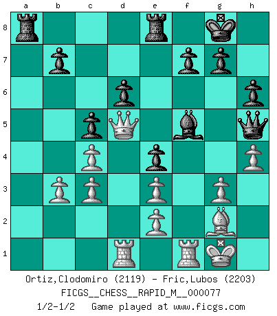 Last move : 1/2-1/2 2015 February 16 17:30:15 [Event "FICGS__CHESS__RAPID_M__000077"] [Site "FICGS"] [Date "2015.01.04"] [Round "1"] [White "Ortiz,Clodomiro"] [Black "Fric,Lubos"] [Result "1/2-1/2"] [WhiteElo "2119"] [BlackElo "2203"] 1.c4 e5 2.Nc3 Nf6 3.g3 Bb4 4.Nf3 e4 5.Ng5 Bxc3 6.dxc3 d6 7.Nh3 O-O 8.Nf4 h6 9.Nd5 Re8 10.Bg2 Bf5 11.O-O Nbd7 12.b3 a5 13.Be3 c6 14.Nxf6+ Nxf6 15.Qd2 a4 16.Rad1 Ng4 17.Bd4 axb3 18.axb3 c5 19.Be3 Nxe3 20.fxe3 Qg5 21.h4 Qh5 22.Qd5 1/2-1/2 English : Bremen, Smyslov system Kingside Castling by player Black (move 7) Kingside Castling by player White (move 11) This chess game ended in a draw. Follow this game move after move (download)By the beauty of his games, the clarity of his play, and the brilliance of his ideas, Fischer made himself an artist of the same stature as Brahms, Rembrandt, and Shakespeare. (David Levy) Wer mein Gambit spielt, muß bereit sein, alle Brücken hinter sich abzubrechen. Es verändert den ganzen Menschen. Es wirkt wie ein Zauberstab und fördert verkümmerte, gute Charakter- eigenschaften wieder zu Tage. (Emil Joseph Diemer) La batalla por la última verdad nunca sera ganada. Y es por eso que el Ajedrez es tan fascinante. (Hans Kmoch) On a dit que l'homme se distingue de l'animal par le fait qu'il achète plus de livres qu'il ne peut en lire. Je voudrais suggérer qu'inclure à la liste des livres quelques livres d'échecs rendrait la distinction manifeste. (Edward Lasker) CHESS, n. f. [echecs, Fr.] A nice and abstruse game, in which two sets of puppets are moved in opposition to each other. (Dr Samuel Johnson, A Dictionary Of The English Language, 1755)