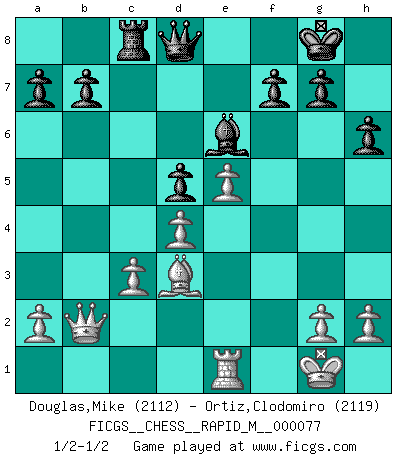 Last move : 1/2-1/2 2015 January 10 6:14:41 [Event "FICGS__CHESS__RAPID_M__000077"] [Site "FICGS"] [Date "2015.01.04"] [Round "1"] [White "Douglas,Mike"] [Black "Ortiz,Clodomiro"] [Result "1/2-1/2"] [WhiteElo "2112"] [BlackElo "2119"] 1.e4 e5 2.Nf3 Nf6 3.Nxe5 d6 4.Nf3 Nxe4 5.d4 d5 6.Bd3 Bd6 7.O-O O-O 8.c4 c6 9.cxd5 cxd5 10.Nc3 Re8 11.Re1 Nxc3 12.Rxe8+ Qxe8 13.bxc3 Nd7 14.Qb3 Nb6 15.Ba3 Bxa3 16.Qxa3 Be6 17.Re1 h6 18.Ne5 Nd7 19.f4 Nxe5 20.fxe5 Qd8 21.Qb2 Rc8 1/2-1/2 Petrov : Classical attack, Marshall variation Kingside Castling by player White (move 7) Kingside Castling by player Black (move 7) This chess game ended in a draw. Follow this game move after move (download)It is difficult to play against Einstein's theory --on his first loss to Fischer. (Mikhail Tal) Der Schachmeister von Heute braucht Courage, einen Killerinstinkt, Ausdauer und Arroganz. (Larry Evans) Ciertamente, de todas la drogas del mundo, el Ajedrez debe ser el mas placentero permamentemente. (Assiac) Je ne suis pas le dernier à jouer lâchement des coups douteux pendant le zeïtnot de l'adversaire pour l'achever: en effet les coups qui font le plus peur sont ceux que l'on ne comprend pas. Je me fais souvent peur quand je joue. (Un professeur anonyme) Chess is as much a mystery as women. (Purdy)