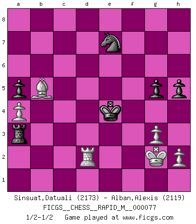 Last move : 1/2-1/2 2015 March 25 13:32:18 [Event "FICGS__CHESS__RAPID_M__000077"] [Site "FICGS"] [Date "2015.01.04"] [Round "1"] [White "Sinsuat,Datuali"] [Black "Alban,Alexis"] [Result "1/2-1/2"] [WhiteElo "2173"] [BlackElo "2119"] 1.e4 c5 2.Nf3 e6 3.c3 Nf6 4.e5 Nd5 5.Bc4 d6 6.d4 Be7 7.Qe2 dxe5 8.dxe5 a6 9.a4 Nc6 10.O-O Na5 11.Ba2 Bd7 12.Nbd2 Nf4 13.Qe4 g5 14.b4 Bc6 15.Qe3 cxb4 16.cxb4 Bxb4 17.Ne4 Qd3 18.Nfxg5 Ne2+ 19.Kh1 Nxc1 20.Nf6+ Ke7 21.Raxc1 Qxe3 22.fxe3 Ba3 23.Rc3 Bb2 24.Rc2 Bxe5 25.Ng4 f6 26.Nxe5 fxg5 27.Rf7+ Kd6 28.Nxc6 Nxc6 29.Rxb7 Rab8 30.Rg7 Rbg8 31.Rb7 Rb8 32.Rg7 Rbg8 33.Rxg8 Rxg8 34.Bxe6 Re8 35.Bc4 Rxe3 36.g3 a5 37.Bg8 h6 38.Rd2+ Kc7 39.Kg2 Ne7 40.Bh7 Ra3 41.Bc2 Kb6 42.Bd1 Kc5 43.Rc2+ Kd4 44.Rd2+ Kc4 45.Be2+ Kc5 46.Rc2+ Kd4 47.Bb5 h5 48.Rd2+ Ke4 49.Re2+ Re3 50.Rd2 Ra3 51.Re2+ Re3 52.Rd2 Ra3 1/2-1/2 Sicilian defense Kingside Castling by player White (move 10) This chess game ended in a draw. Follow this game move after move (download)Some sacrifices are sound; the rest are mine. (Mikhail Tal) Ein Kibitz ist einer, der deinem Gegner gute Ratschläge gibt. (Andrew Soltis) Yo nunca en mi vida he jugado la Defensa Francesa, que viene siendo la más aburrida de todas las Aperturas. (Wilhelm Steinitz) Mon pion favori sur ma case favorite ! Bronstein en parlant d'un coup de pion en h5 quand il avait les Noirs. Nowadays, anyone who cannot speak English and is incapable of using the Internet is regarded as backward. (Al-Waleed bin Talal)