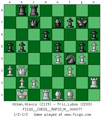 Last move : 1/2-1/2 2015 March 30 15:16:18 [Event "FICGS__CHESS__RAPID_M__000077"] [Site "FICGS"] [Date "2015.01.04"] [Round "1"] [White "Alban,Alexis"] [Black "Fric,Lubos"] [Result "1/2-1/2"] [WhiteElo "2119"] [BlackElo "2203"] 1.e4 c5 2.Nf3 d6 3.d4 cxd4 4.Nxd4 Nf6 5.Nc3 a6 6.Bg5 Nbd7 7.Qe2 h6 8.Bh4 e5 9.Nf5 g6 10.Ne3 Be7 11.f3 b5 12.a3 Kf8 13.O-O-O Kg7 14.g4 Nc5 15.Bg3 Bd7 16.h4 Rb8 17.Ncd5 Nxd5 18.Nxd5 Be6 19.Kb1 Bxd5 20.Rxd5 Qc7 21.Be1 Ne6 22.Qe3 Nf4 23.Rd1 Rhc8 24.Rh2 a5 25.h5 g5 26.Qb3 Qb6 27.Bf2 Qc7 28.Be1 Qb6 29.Bf2 Qc7 30.Be1 1/2-1/2 Sicilian : Najdorf, 6.Bg5 Queenside Castling by player White (move 13) This chess game ended in a draw. Follow this game move after move (download)You cannot play at Chess if you are kind-hearted. (French Proverb) Darum geht es im Schach. Einen Tag gibst du deinem Gegner eine Lektion, am nächsten Tag gibt er dir eine. (Robert James Fischer) El juego de Fischer siempre fue nítido, racional y brillante. Uno de los mejores por siempre. (Dave Regis) Que feriez-vous si vous étiez en train de jouer aux échecs et que la fin du monde arrive ? Je continuerais à jouer. (Saint Borromée) SEO proverb : Make your website optimized for human beings, not for search engines.