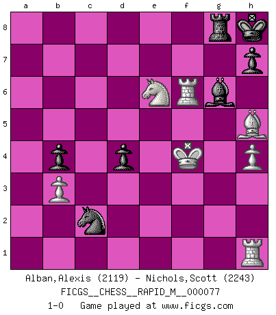 Last move : 1-0 2015 January 27 14:38:23 [Event "FICGS__CHESS__RAPID_M__000077"] [Site "FICGS"] [Date "2015.01.04"] [Round "1"] [White "Alban,Alexis"] [Black "Nichols,Scott"] [Result "1-0"] [WhiteElo "2119"] [BlackElo "2243"] 1.e4 e6 2.d4 d5 3.Nc3 Nf6 4.e5 Nfd7 5.f4 c5 6.Nf3 Nc6 7.Be3 cxd4 8.Nxd4 Bc5 9.Qd2 O-O 10.g3 a6 11.Bg2 Nxd4 12.Bxd4 Bxd4 13.Qxd4 b5 14.O-O Qb6 15.Ne2 Bb7 16.Qxb6 Nxb6 17.Rfc1 Rac8 18.Nd4 Nc4 19.Rcb1 g5 20.Kf2 Kh8 21.b3 Na3 22.Rc1 gxf4 23.gxf4 f6 24.Ke3 fxe5 25.fxe5 Rg8 26.Bf3 b4 27.Be2 a5 28.Bd3 Rg5 29.Kf4 Rcg8 30.Rf1 Bc8 31.Rf3 Rh5 32.Raf1 Bd7 33.h3 a4 34.Rh1 axb3 35.axb3 Rh4+ 36.Ke3 Rh5 37.Rf7 Be8 38.Rf6 Rxe5+ 39.Kf4 Rh5 40.Nxe6 Bg6 41.h4 Nxc2 42.Be2 d4 43.Bxh5 1-0 French : Steinitz, Boleslavsky variation Kingside Castling by player Black (move 9) Kingside Castling by player White (move 14) Player White won this chess game. Follow this game move after move (download)Best by test: 1. e4 (Bobby Fischer) Fischer machte Schach einfach zu einer aufregenden Sache, wann immer er sich ans Brett setzte. (Raymond Keene) Uno no tiene que jugar muy bien, es suficiente jugar mejor que el oponente. (Siegbert Tarrasch) Les Echecs sont affaire de jugement sensible. Savoir quand frapper et quand esquiver. (Fischer) All the troubles of the world come from being unable to sit alone in a quiet room. (Blaise Pascal)