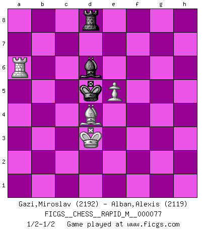 Last move : 1/2-1/2 2015 May 5 21:54:54 [Event "FICGS__CHESS__RAPID_M__000077"] [Site "FICGS"] [Date "2015.01.04"] [Round "1"] [White "Gazi,Miroslav"] [Black "Alban,Alexis"] [Result "1/2-1/2"] [WhiteElo "2192"] [BlackElo "2119"] 1.d4 Nf6 2.Bg5 d5 3.Nd2 Nbd7 4.Ngf3 g6 5.c4 c5 6.e3 Bg7 7.Be2 cxd4 8.Nxd4 Nc5 9.Bh4 dxc4 10.Nxc4 O-O 11.Rc1 Ne6 12.Nb5 Qxd1+ 13.Rxd1 Rd8 14.Rxd8+ Nxd8 15.O-O Bd7 16.Ne5 Be6 17.Nc7 Rc8 18.Nxe6 Nxe6 19.Bf3 Rc2 20.Nd3 g5 21.Bg3 g4 22.Bxb7 Rd2 23.Ba6 Ne4 24.Rb1 N4c5 25.Nxc5 Nxc5 26.Bf1 Bxb2 27.Bb8 a6 28.Bc7 Ba3 29.Be5 h5 30.h3 Ne4 31.hxg4 hxg4 32.Bxa6 Nxf2 33.Bc4 Ne4 34.Rf1 e6 35.Rf4 Rd1+ 36.Kh2 g3+ 37.Kh3 Rh1+ 38.Kg4 Rc1 39.Bb3 Bc5 40.Kf3 Nd2+ 41.Ke2 Nxb3 42.axb3 Rc2+ 43.Kf3 Kf8 44.Rc4 Rf2+ 45.Ke4 Ba3 46.Bxg3 Rxg2 47.Kf3 Rd2 48.b4 Rb2 49.Be5 Rb1 50.Bd6+ Kg7 51.Bc5 f5 52.Kf4 Kf6 53.Bd4+ Kg6 54.Rc6 Rxb4 55.Rxe6+ Kf7 56.Rf6+ Ke7 57.Kxf5 Rb5+ 58.Ke4 Rg5 59.Ra6 Bd6 60.Ra7+ Ke6 61.Kd3 Bc5 62.Ra6+ Bd6 63.Kc4 Rf5 64.Bc3 Rf3 65.e4 Rf7 66.e5 Rd7 67.Bd4 Rd8 68.Rc6 Rd7 69.Rb6 Rd8 70.Ba1 Rd7 71.Bb2 Rd8 72.Bd4 Rd7 73.Ra6 Rd8 74.Kd3 Kd5 1/2-1/2 Trompowsky attack (Ruth, Opovcensky Opening) Kingside Castling by player Black (move 10) Kingside Castling by player White (move 15) 10 pieces endgame at move 46 : White KRBPP , Black KRBPP WHITE : King + 1 Rook 1 Bishop 2 Pawns BLACK : King + 1 Rook 1 Bishop 2 Pawns 9 pieces endgame at move 54 : White KRBP , Black KRBPP WHITE : King + 1 Rook 1 Bishop 1 Pawn BLACK : King + 1 Rook 1 Bishop 2 Pawns 8 pieces endgame at move 55 : White KRBP , Black KRBP WHITE : King + 1 Rook 1 Bishop 1 Pawn BLACK : King + 1 Rook 1 Bishop 1 Pawn 7 pieces endgame at move 57 : White KRBP , Black KRB WHITE : King + 1 Rook 1 Bishop 1 Pawn BLACK : King + 1 Rook 1 Bishop This chess game ended in a draw. Follow this game move after move (download)Chess is the art of analysis. (Mikhail Botvinnik) Frage des Reporters: -Welche besonderen Umstände rechtfertigen das Anhalten der Uhren während einer Turnierpartie? Antwort: -Einen Fotographen zu strangulieren. (Siegbert Tarrasch) La esencia del Ajedrez es pensar acerca de lo que el Ajedrez es. (David Bronstein) Toutes les manuvres exécutées sur une colonne ouverte ont pour but ultime l'intrusion définitive sur la septième ou la huitième rangée, en plein cur de la position ennemie. (Aaron Nimzovitch) It is the aim of the modern school, not to treat every position according to one general law, but according to the principle inherent in the position. (Richard Reti)