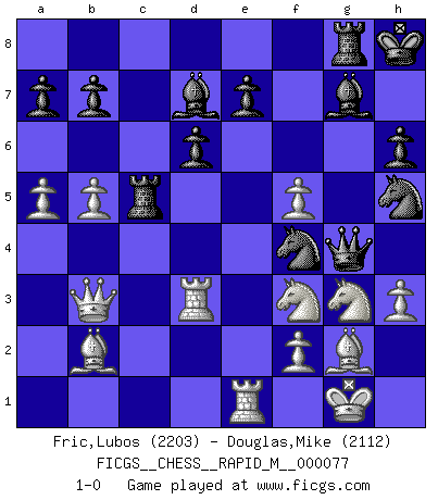 Last move : 1-0 2015 June 9 0:31:51 [Event "FICGS__CHESS__RAPID_M__000077"] [Site "FICGS"] [Date "2015.01.04"] [Round "1"] [White "Fric,Lubos"] [Black "Douglas,Mike"] [Result "1-0"] [WhiteElo "2203"] [BlackElo "2112"] 1.d4 f5 2.c4 Nf6 3.g3 g6 4.Bg2 Bg7 5.Nf3 O-O 6.O-O d6 7.Nc3 Qe8 8.d5 Na6 9.Rb1 Bd7 10.b4 c6 11.Qb3 Kh8 12.Rd1 cxd5 13.cxd5 Nc7 14.b5 h6 15.Bb2 Qf7 16.e3 Rac8 17.Rd2 g5 18.a4 Na8 19.a5 Nc7 20.Nd4 f4 21.exf4 gxf4 22.Rf1 Qh5 23.Nce2 Ncxd5 24.gxf4 Rc5 25.Re1 Qh4 26.Qg3 Qh5 27.f5 Rg8 28.Qb3 Qg5 29.Rd3 Nh5 30.Ng3 Ndf4 31.Nf3 Qg4 32.h3 1-0 Dutch : Leningrad, Main variation Kingside Castling by player Black (move 5) Kingside Castling by player White (move 6) Player White won this chess game. Follow this game move after move (download)The Pin is mightier than the sword. (Fred Reinfeld) Ich tröste mich mit dem Vergnügen, daß Schachfans, Zuschauer und Leser glücklich sind, wenn ein Großmeister etwas riskiert, statt nur Klötzchen zu schieben. (Mikhail Nekhemyevich Tal) La caracteristica mas importante en la posición del Ajedrez es la actividad de las piezas. Esto es absolutamente fundamental en todas las fases del juego: Apertura, Juego Medio y especialmente Finales. La limitación primordial en la actividad de una pieza, es la estructuración de los Peones. (Michael Stean) Assurément je connaissais par expérience le mystérieux attrait de ce jeu royal, le seul entre tous les jeux inventés par les hommes qui échappe souverainement à la tyrannie du hasard, le seul où l'on ne doive sa victoire qu'à son intelligence ou plutôt à une certaine forme d'intelligence. Mais n'est-ce pas déjà le limiter injurieusement que d'appeler les échecs un jeu ? N'est-ce pas une science, un art ou quelque chose qui, comme le cercueil de Mahomet entre ciel et terre, est suspendu entre l'un et l'autre, et qui réunit un nombre incroyable de contraires ? [...] C'est une pensée qui ne mène à rien, une mathématique qui n'établit rien, un art qui ne laisse pas d'uvre, une architecture sans matière; et il l'a prouvé néanmoins qu'il était plus durable, à sa manière, que les livres ou que tout autre monument, ce jeu unique qui appartient à tous les peuples et à tous les temps, et dont personne ne sait quel dieu en fit don à la terre pour tuer l'ennui, pour aiguiser l'esprit et stimuler l'âme. Où commence-t-il, où finit-il ? (Stefan Zweig) To send light into the darkness of men's hearts - such is the duty of the artist. (Schumann)