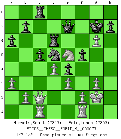 Last move : 1/2-1/2 2015 March 26 19:6:13 [Event "FICGS__CHESS__RAPID_M__000077"] [Site "FICGS"] [Date "2015.01.04"] [Round "1"] [White "Nichols,Scott"] [Black "Fric,Lubos"] [Result "1/2-1/2"] [WhiteElo "2243"] [BlackElo "2203"] 1.d4 d5 2.c4 c6 3.Nf3 Nf6 4.Nc3 e6 5.Bg5 Nbd7 6.cxd5 exd5 7.e3 Be7 8.Bd3 O-O 9.h3 Re8 10.O-O Ne4 11.Bf4 Ndf6 12.Ne5 g6 13.Rc1 Bd6 14.Ne2 Nh5 15.Bh2 f6 16.Bxe4 dxe4 17.Nc4 Bxh2+ 18.Kxh2 Be6 19.Qc2 Bd5 20.Nd2 f5 21.Nc3 Nf6 22.Nxd5 Nxd5 23.a3 Kg7 24.Nc4 Re6 25.Ne5 Qe7 26.g3 a6 27.Kg2 Rc8 28.h4 c5 29.h5 Rd6 30.hxg6 1/2-1/2 QGD Slav : 4.Nc3 Kingside Castling by player Black (move 8) Kingside Castling by player White (move 10) This chess game ended in a draw. Follow this game move after move (download)The blunders are all there on the board, waiting to be made. (Savielly Tartakover) Charakterschwächen offenbaren sich normalerweise während einer Schachpartie. (Garry Kasparov) Las combinaciones han sido siempre el aspecto más intrigante del Ajedrez. Los Maestros las buscan, el público las aplauden, los críticos las alaban. La razón se debe a que las combinaciones hacen posible que el Ajedrez sea más que un ejercicio matemático con una carencia de vida. Ellas son la poesía del juego, son del Ajedrez lo que la melodía es de la música. Ellas representan el triunfo de la mente sobre la materia. (Reuben Fine) Donnez-moi un Cavalier en 6e et je gagnerais toutes mes parties. (Steinitz) Always be a first-rate version of yourself, instead of a second-rate version of somebody else. (Judy Garland)