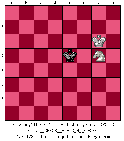 Last move : 1/2-1/2 2015 February 17 20:57:32 [Event "FICGS__CHESS__RAPID_M__000077"] [Site "FICGS"] [Date "2015.01.04"] [Round "1"] [White "Douglas,Mike"] [Black "Nichols,Scott"] [Result "1/2-1/2"] [WhiteElo "2112"] [BlackElo "2243"] 1.e4 e6 2.d4 d5 3.Nd2 c5 4.exd5 exd5 5.Ngf3 Nf6 6.Bb5+ Bd7 7.Bxd7+ Nbxd7 8.O-O Be7 9.dxc5 Nxc5 10.Nb3 Nce4 11.Nfd4 O-O 12.Nf5 Re8 13.Nxe7+ Rxe7 14.Be3 Qc7 15.Bd4 Rae8 16.Re1 Re6 17.f3 Ng5 18.Rxe6 fxe6 19.Qd2 Nf7 20.Qf2 b6 21.Bxf6 gxf6 22.Rd1 Ne5 23.f4 Nc4 24.c3 Nd6 25.Nd4 Ne4 26.Qf3 Kh8 27.g3 Qe7 28.Qe2 Rg8 29.Kg2 Qd6 30.Qe3 Qd7 31.Qd3 Nc5 32.Qe2 Rc8 33.Nc2 Re8 34.Kg1 Qc8 35.c4 dxc4 36.Qxc4 Rd8 37.Rxd8+ Qxd8 38.Qd4 Qxd4+ 39.Nxd4 e5 40.Nc6 exf4 41.gxf4 Nd3 42.Nxa7 Nxb2 43.Kg2 Kg7 44.Kf3 Na4 45.Nb5 Kg6 46.Ke4 Nc5+ 47.Ke3 Kh5 48.Nc7 Kg4 49.Nd5 Nd7 50.Kf2 Kh3 51.Kg1 b5 52.Nc3 Nb6 53.Nxb5 Kg4 54.Nc3 Kxf4 55.Kf2 f5 56.a4 Nc4 57.Nd5+ Ke5 58.Ne3 Nb2 59.a5 f4 60.Nc2 Nd3+ 61.Kf3 Kd6 62.Ke4 Nc5+ 63.Kxf4 Kc6 64.Kg5 Kb5 65.Kh6 Kxa5 66.Kxh7 Nd3 67.Kg6 Kb6 68.h4 Kc7 69.Ne1 Nf4+ 70.Kf5 Ne2 71.Kf6 Nf4 72.Nd3 Nh5+ 73.Kg5 Ng3 74.Kg4 Ne4 75.Kf4 Nf6 76.Kf5 Nh5 77.Kg4 Nf6+ 78.Kg5 Ne4+ 79.Kg6 Ng3 80.Nf2 Kd6 81.Nh3 Ke5 82.h5 Nxh5 83.Kxh5 Kf5 84.Ng5 Ke5 85.Kg6 1/2-1/2 French : Tarrasch, Open, 4.ed ed Kingside Castling by player White (move 8) Kingside Castling by player Black (move 11) 10 pieces endgame at move 42 : White KNPPP , Black KNPPP WHITE : King + 1 Knight 3 Pawns BLACK : King + 1 Knight 3 Pawns 9 pieces endgame at move 53 : White KNPPP , Black KNPP WHITE : King + 1 Knight 3 Pawns BLACK : King + 1 Knight 2 Pawns 8 pieces endgame at move 54 : White KNPP , Black KNPP WHITE : King + 1 Knight 2 Pawns BLACK : King + 1 Knight 2 Pawns 7 pieces endgame at move 63 : White KNPP , Black KNP WHITE : King + 1 Knight 2 Pawns BLACK : King + 1 Knight 1 Pawn 6 pieces endgame at move 65 : White KNP , Black KNP WHITE : King + 1 Knight 1 Pawn BLACK : King + 1 Knight 1 Pawn 5 pieces endgame at move 66 : White KNP , Black KN WHITE : King + 1 Knight 1 Pawn BLACK : King + 1 Knight 4 pieces endgame at move 82 : White KN , Black KN WHITE : King + 1 Knight BLACK : King + 1 Knight 3 pieces endgame at move 83 : White KN , Black K WHITE : King + 1 Knight BLACK : King + This chess game ended in a draw. Follow this game move after move (download)The Pawns are the soul of the game. (Francois Andre Danican Philidor) Über Frauen: Chess is better. (Robert James Fischer) El Rey es una pieza de pelea. ¡Usenlo!. (Wilhelm Steinitz) Psychologiquement, tu dois avoir confiance en toi même, mais cette confiance doit être basée sur des faits. (Robert Fischer) A person who never made a mistake never tried anything new. (Albert Einstein)