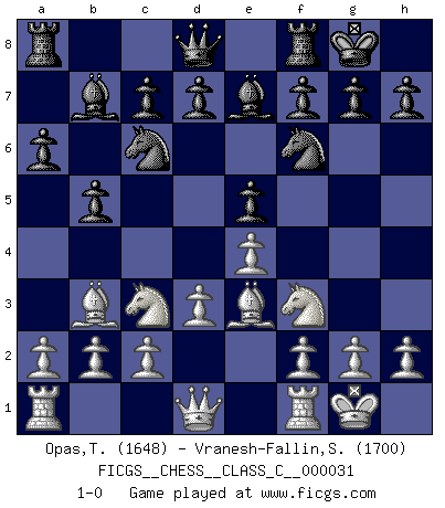 Last move : 1-0 2007 April 30 19:20:8 [Event "FICGS__CHESS__CLASS_C__000031"] [Site "FICGS"] [Date "2007.02.27"] [Round "1"] [White "Opas,Torsten"] [Black "Vranesh-Fallin,Scott"] [Result "1-0"] [WhiteElo "1648"] [BlackElo "1700"] 1.e4 e5 2.Nf3 Nc6 3.Bb5 a6 4.Ba4 Nf6 5.O-O Be7 6.Nc3 b5 7.Bb3 Bb7 8.d3 O-O 9.Be3 1-0 This chess game has been lost on time (started : 2007.02.27 23:55:27) Ruy Lopez : Closed defense Kingside Castling by player White (move 5) Kingside Castling by player Black (move 8) Player White won this chess game. Follow this game move after move (download)When you absolutely don't know what to do anymore, it is time to panic. (John van der Wiel) Auf Remis zu spielen ist gewissermaßen ein Verbrechen gegen das Schachspiel. (Mikhail Nekhemyevich Tal) a manera como él juega al Ajedrez, demuestra la completa naturaleza de un hombre. (Stanley Ellin) Si le désir cupide (et stupide) de gagner est une inépuisable source de souffrance, une combinaison brillante sur l'échiquier est une découverte : le coquelicot qui s'épanouit lorsque apparaît la Voie Lactée. (Arrabal) I've lost money so fast in these clubs it's left me reeling. I've read every poker book ever written, but the only way to get better at the game is to go out and play with people who are really good. The problem is, you stand to lose a lot of money doing it. (Matt Damon)