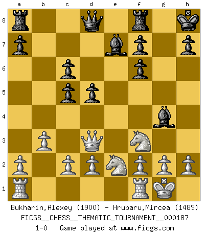 Last move : 1-0 2015 June 4 23:57:58 [Event "FICGS__CHESS__THEMATIC_TOURNAMENT__000187"] [Site "FICGS"] [Date "2015.01.05"] [Round "1"] [White "Bukharin,Alexey"] [Black "Hrubaru,Mircea"] [Result "1-0"] [WhiteElo "1900"] [BlackElo "1489"] 1.Nf3 d5 2.b3 c5 3.e4 e6 4.exd5 exd5 5.Bb5+ Nc6 6.Qe2+ Be7 7.Bb2 Nf6 8.Bxf6 gxf6 9.Nc3 O-O 10.O-O Bg4 11.Bxc6 bxc6 12.Qd3 Kh8 13.Ne2 1-0 This chess game has been lost on time (started : 2015.01.05 17:4:4) Reti : Nimzovich-Larsen attack Kingside Castling by player Black (move 9) Kingside Castling by player White (move 10) Player White won this chess game. Follow this game move after move (download)Without error there can be no brilliancy. (Emanuel Lasker) Es gibt nur zwei wahre Schachgenies - das andere war Wilhelm Steinitz, der Weltmeister von 1872 bis 1894. (Robert James Fischer) Hasta este punto, las blancas han seguido un análisis bien conocido. Pero ahora el hace un error fatal: empieza a usar su propia cabeza. (Siegbert Tarrasch) Des combinaisons [dans le jeu d'échecs] pareilles à des mélodies. Je crois entendre pour ainsi dire la musique des coups... (Vladimir Nabokov) Perception is reality. (Immanuel Kant)