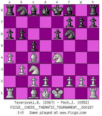 Last move : 1-0 2015 April 24 20:11:28 [Event "FICGS__CHESS__THEMATIC_TOURNAMENT__000187"] [Site "FICGS"] [Date "2015.01.05"] [Round "1"] [White "Teverovski,Bogoljub"] [Black "Pech,Jaroslav"] [Result "1-0"] [WhiteElo "2067"] [BlackElo "0952"] 1.Nf3 d5 2.b3 c5 3.e4 dxe4 4.Ng5 Nf6 5.Bc4 e6 6.Nc3 a6 7.a4 b6 8.Ngxe4 1-0 This chess game has been lost on time (started : 2015.01.05 17:4:4) Reti : Nimzovich-Larsen attack Player White won this chess game. Follow this game move after move (download)Adequate compensation for a sacrifice is having a sound combination leading to a winning position; adequate compensation for a blunder is having your opponent snatch defeat from the jaws of victory. (Bruce A. Moon) Im Spitzenschach von heute geht es nur um Vorbereitung, um tiefgründige, sorgfältige Eröffnungsvorbereitung. (Nigel Short) Los Peones son nacidos libres, y aún así, se encuentran por doquier encadenados. (Rick Kennedy) Les pièces de l'échiquier étaient impitoyables. Elles le retenaient, elles l'absorbaient. Il y avait de l'horreur en cela, mais aussi une harmonie unique. Car, qu'y a-t-il dans le monde, à part les échecs ? (V. Nabokov) The ultimate in disposing one's troops is to be without ascertainable shape. Then the most penetrating spies cannot pry in nor can the wise lay plans against you. (Sun Tzu)