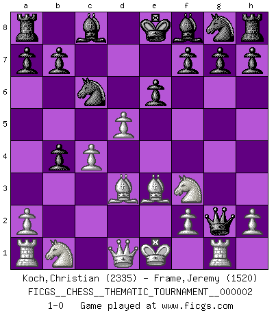 Last move : 1-0 2006 June 19 9:50:30 [Event "FICGS__CHESS__THEMATIC_TOURNAMENT__000002"] [Site "FICGS"] [Date "2006.05.30"] [Round "1"] [White "Koch,Christian"] [Black "Frame,Jeremy"] [Result "1-0"] [WhiteElo "2335"] [BlackElo "1520"] 1.e4 c5 2.b4 cxb4 3.Nf3 Nc6 4.d4 d5 5.exd5 Qxd5 6.c4 Qe4+ 7.Be3 e6 8.Bd3 Qg4 9.d5 Qxg2 10.Rg1 1-0 Sicilian : wing gambit Player White won this chess game. Follow this game move after move (download)Pawn endings are to Chess what putting is to golf. (Cecil Purdy) Zeige mir drei Eröffnungsvarianten und ich beweise dir, dass zwei davon inkorrekt sind. (Emanuel Lasker) El Ajedrez es despiadado: debes de estar preparado para matar gente. (Nigel Short) Il n'y a plus de joueurs du niveau de Jacob Murray dont la seule quête est le beau jeu, le plaisir de voir les pièces construire quelque chose. Sur 10 idées à la minute, 9 seront sans intérêt, la dernière s'avèrera géniale. (Christian Bauer) Hold em is to stud what chess is to checkers. (Johnny Moss)