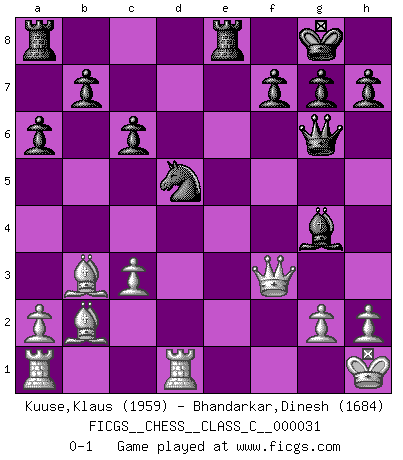 Last move : 0-1 2007 April 9 8:16:9 [Event "FICGS__CHESS__CLASS_C__000031"] [Site "FICGS"] [Date "2007.02.27"] [Round "1"] [White "Kuuse,Klaus"] [Black "Bhandarkar,Dinesh"] [Result "0-1"] [WhiteElo "1959"] [BlackElo "1684"] 1.e4 e5 2.Nf3 Nc6 3.Bb5 a6 4.Ba4 Nf6 5.O-O Bc5 6.Nxe5 Nxe5 7.d4 Nxe4 8.Qe2 Be7 9.Qxe4 Ng6 10.c4 O-O 11.Nc3 c6 12.f4 Bf6 13.f5 d5 14.cxd5 Re8 15.Qd3 Ne7 16.Re1 Bxf5 17.Qf3 Bxd4+ 18.Kh1 Nxd5 19.Rd1 Bxc3 20.bxc3 Qf6 21.Bb2 Qg6 22.Bb3 Bg4 0-1 Ruy Lopez : Moeller defense Kingside Castling by player White (move 5) Kingside Castling by player Black (move 10) Player Black won this chess game. Follow this game move after move (download)Openings teach you openings. Endgames teach you chess ! (Stephan Gerzadowicz) Schach ist die gewalttätigste aller Sportarten. (Garry Kasparov) Si el Ajedrez es una ciencia, es la mas inexacta. Si el Ajedrez es un arte, es demasiado inexacto para ser visto como tal. Si el Ajedrez es un deporte, es demasiado esotérico. Si el Ajedrez es un juego, es demasiado exigente para ser solo un juego. Si el Ajedrez es una aventura, es una muy demandante. Si el Ajedrez es una pasión, es una muy gratificante. Si el Ajedrez es la vida, es una muy triste. (Anónimo) Fischer est le meilleur joueur du monde et Karpov n'est qu'un joueur de bistrot. (Garry Kasparov, agé de 16 ans) Train yourself to let go of everything you fear to lose. (Master Yoda in Star Wars ep.3)