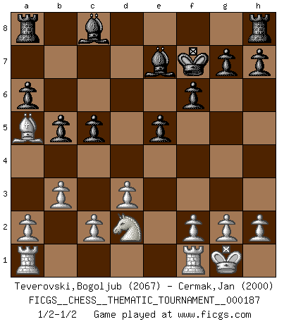 Last move : 1/2-1/2 2015 April 27 12:24:56 [Event "FICGS__CHESS__THEMATIC_TOURNAMENT__000187"] [Site "FICGS"] [Date "2015.01.05"] [Round "1"] [White "Teverovski,Bogoljub"] [Black "Cermak,Jan"] [Result "1/2-1/2"] [WhiteElo "2067"] [BlackElo "2000"] 1.Nf3 d5 2.b3 c5 3.e4 dxe4 4.Ne5 Nf6 5.Bb5+ Nbd7 6.Qe2 a6 7.Bxd7+ Nxd7 8.Qxe4 Nxe5 9.Qxe5 Qd4 10.Bb2 Qxe5+ 11.Bxe5 f6 12.Bc3 e5 13.d3 b5 14.Nd2 Kf7 15.O-O Be7 16.Ba5 1/2-1/2 Reti : Nimzovich-Larsen attack Kingside Castling by player White (move 15) This chess game ended in a draw. Follow this game move after move (download)The most powerful weapon in Chess is to have the next move. (David Bronstein) Nach Morphy wurde nichts neues mehr in der Behandlung offener Positionen gefunden. (Mikhail Moiseyevich Botvinik) Me siento como si fuera una pieza en una partida de Ajedrez, cuando mi oponente me indica: esa pieza no puede ser movida. (Soren Kierkegaard) Vous m'avez demandé de vous exposer quel est le fondement de la prière. Je ne fais que préparer les pièces du jeu sur la table... Nous sera-t-il permis d'en adopter les règles et si nous les appliquons scrupuleusement nous ne tarderons pas à faire mat le Roi divin ! Il ne pourra échapper à nos mains. (Sainte Thérèse d'Avila, Chemin de perfection) Be who you are, and say what you feel because those who mind don't matter, and those who matter don't mind. (Dr Seuss)