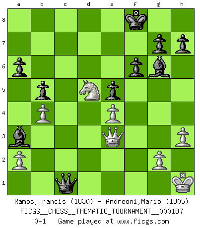 Last move : 0-1 2015 February 19 14:37:40 [Event "FICGS__CHESS__THEMATIC_TOURNAMENT__000187"] [Site "FICGS"] [Date "2015.01.05"] [Round "1"] [White "Ramos,Francis"] [Black "Andreoni,Mario"] [Result "0-1"] [WhiteElo "1830"] [BlackElo "1805"] 1.Nf3 d5 2.b3 c5 3.e4 dxe4 4.Ne5 Nd7 5.Bb5 Ngf6 6.Bb2 a6 7.Bxd7+ Nxd7 8.Qe2 Nxe5 9.Bxe5 Bf5 10.Nc3 f6 11.Bg3 Qd4 12.O-O e5 13.Rfe1 Rd8 14.Rad1 e3 15.fxe3 Qd7 16.h3 Bxc2 17.Rc1 Bg6 18.Bf2 Qxd2 19.Qc4 Qd7 20.Red1 Bd6 21.Rd2 b5 22.Qe2 Qc6 23.e4 O-O 24.Nd5 Rc8 25.Bxc5 Bxc5+ 26.Kh1 Qe6 27.Rdc2 Ba3 28.Rxc8 Rxc8 29.Rxc8+ Qxc8 30.b4 Kf8 31.Qe3 Qc1+ 0-1 Reti : Nimzovich-Larsen attack Kingside Castling by player White (move 12) Kingside Castling by player Black (move 23) Player Black won this chess game. Follow this game move after move (download)Chess is mental torture. (Garry Kasparov) Ohne Leiden bildet sich kein Charakter. (Ernst Freiherr von Feuchtersleben) Aquel que toma al Peón de Caballo de la Reina, se pasará la noche a dormir en la calle. (Anónimo) Les échecs c'est le défi de l'alpiniste, toujours plus haut, prêt à tout pour monter à l'assaut du Roi ennemi. Les échecs, c'est de la musique en mouvement, un ballet majestueux pour les yeux. C'est de la poésie composée par les fantômes du passé qui au même titre que Rimbaud ou Verlaine méritent notre admiration. Les échecs, c'est de la peinture ou le moindre mouvement modifie le tableau pour en faire un Picasso ou un Van Gogh. Les échecs, c'est tout et rien, c'est la vie et la mort. Jjulie33 sur le forum de France-Echecs. To err is human, but to really foul things up requires a computer. (Farmer's Almanac, 1978)
