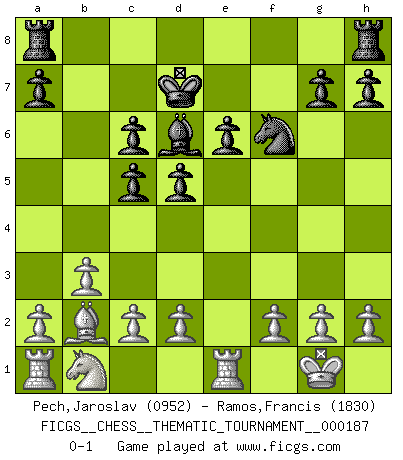 Last move : 0-1 2015 May 20 22:44:56 [Event "FICGS__CHESS__THEMATIC_TOURNAMENT__000187"] [Site "FICGS"] [Date "2015.01.05"] [Round "1"] [White "Pech,Jaroslav"] [Black "Ramos,Francis"] [Result "0-1"] [WhiteElo "0952"] [BlackElo "1830"] 1.Nf3 d5 2.b3 c5 3.e4 e6 4.exd5 exd5 5.Bb5+ Nc6 6.O-O Nf6 7.Qe2+ Be6 8.Bxc6+ bxc6 9.Ng5 Qd7 10.Nxe6 Qxe6 11.Qxe6+ fxe6 12.Bb2 Bd6 13.Re1 Kd7 0-1 This chess game has been lost on time (started : 2015.01.05 17:4:4) Reti : Nimzovich-Larsen attack Kingside Castling by player White (move 6) Player Black won this chess game. Follow this game move after move (download)First-class players lose to second class players because second-class players sometimes play a first-class game. (Tarrasch) Ich bewundere Kasparows phantasievolle Angriffssiege aus den Achtzigern und Neunzigern, aber wenn man sie mit dem Computer überprüft, nimmt der Computer in jeder zweiten Partie die Opfer an, verteidigt sich und gewinnt. (Vladimir Kramnik) Los problemas de Ajedrez exigen del compositor las mismas virtudes que caracterizan todo el arte de valor: originalidad, invención, concisión, armonía, complejidad e insinceridad explendida. (Vladimir Nabokov) Un journaliste : 'Vous préférez avoir une dame de plus sur l'échiquier ou au lit ?' Boris Spassky : 'Ca dépend de la position.' For peace of mind, resign as general manager of the universe. (Douglas Adams)