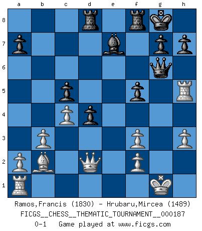 Last move : 0-1 2015 February 28 13:27:46 [Event "FICGS__CHESS__THEMATIC_TOURNAMENT__000187"] [Site "FICGS"] [Date "2015.01.05"] [Round "1"] [White "Ramos,Francis"] [Black "Hrubaru,Mircea"] [Result "0-1"] [WhiteElo "1830"] [BlackElo "1489"] 1.Nf3 d5 2.b3 c5 3.e4 e6 4.exd5 exd5 5.Bb2 Nf6 6.Bb5+ Nc6 7.O-O Bd6 8.Re1+ Be6 9.d4 O-O 10.Bxc6 bxc6 11.Nbd2 cxd4 12.Nxd4 Bd7 13.c4 Qb6 14.h3 c5 15.N4f3 d4 16.Ne4 Nxe4 17.Rxe4 Bc6 18.Rg4 Rad8 19.Qd2 f5 20.Rh4 Bxf3 21.gxf3 Be7 22.Rh5 Qg6+ 0-1 Reti : Nimzovich-Larsen attack Kingside Castling by player White (move 7) Kingside Castling by player Black (move 9) Player Black won this chess game. Follow this game move after move (download)Fischer is completely natural. He plays no roles. He's like a child. Very, very simple. (Zita Rajcsanyi) Computer sind die einzigen Gegner, die nicht immer eine Ausrede auf Lager haben, wenn sie gegen mich verlieren. (Robert James Fischer) Fischer no está bajo la obligación de nadie. (Joseph Platz) La tactique, c'est ce que vous faites quand il y a quelque chose à faire; la stratégie, c'est ce que vous faites quand il n'y a rien à faire. (Savielli Tartacower) Thibault, I ask for draw. Game 13876. - Sorry Ilmars, you won. (FICGS chat)