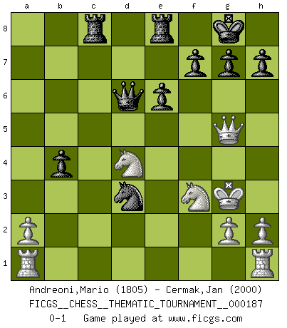 Last move : 0-1 2015 March 21 11:20:51 [Event "FICGS__CHESS__THEMATIC_TOURNAMENT__000187"] [Site "FICGS"] [Date "2015.01.05"] [Round "1"] [White "Andreoni,Mario"] [Black "Cermak,Jan"] [Result "0-1"] [WhiteElo "1805"] [BlackElo "2000"] 1.Nf3 d5 2.b3 c5 3.e4 dxe4 4.Ng5 Nf6 5.Nc3 Bg4 6.Be2 Bf5 7.Bb5+ Nc6 8.Bxc6+ bxc6 9.f3 exf3 10.Qxf3 e6 11.Qxc6+ Nd7 12.d3 c4 13.bxc4 Bb4 14.Bd2 O-O 15.Nf3 Rc8 16.Qb7 a5 17.Qa7 Bc5 18.Qb7 Rb8 19.Qc6 Bb4 20.Nb5 Rc8 21.Qb7 Bxd3 22.Bxb4 axb4 23.cxd3 Nc5 24.Qa7 Qxd3 25.Kf2 Qxc4 26.Nbd4 Nd3+ 27.Kg3 Qd5 28.Qe7 Rfe8 29.Qg5 Qd6+ 0-1 Reti : Nimzovich-Larsen attack Kingside Castling by player Black (move 14) Player Black won this chess game. Follow this game move after move (download)When you absolutely don't know what to do anymore, it is time to panic. (John van der Wiel) Der Vorposten provoziert a) eine Basis für neue Angriffe und b) eine Schwächung der gegnerischen Widerstandskraft in der fraglichen Linie. (Aaron Nimzowitsch) El jugador táctico debe saber que hacer cuando algo se debe de hacer. El estratégico debe saber que hacer cuando nada se debe de hacer. (Savielly Tartakover) Il (Jacob Murray) ne joue pas pour le bon coup, mais pour le meilleur. (Eloi Relange) To be champion requires more than simply being a strong player; one has to be a strong human being as well. (Anatoly Karpov)
