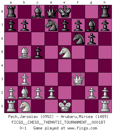 Last move : 0-1 2015 April 25 7:21:24 [Event "FICGS__CHESS__THEMATIC_TOURNAMENT__000187"] [Site "FICGS"] [Date "2015.01.05"] [Round "1"] [White "Pech,Jaroslav"] [Black "Hrubaru,Mircea"] [Result "0-1"] [WhiteElo "0952"] [BlackElo "1489"] 1.Nf3 d5 2.b3 c5 3.e4 dxe4 4.Ne5 Nf6 5.Bb2 Nbd7 6.f4 exf3 7.Qxf3 g6 8.Bb5 Bg7 0-1 This chess game has been lost on time (started : 2015.01.05 17:4:4) Reti : Nimzovich-Larsen attack Player Black won this chess game. Follow this game move after move (download)Could we look into the head of a Chess player, we should see there a whole world of feelings, images, ideas, emotion and passion. (Alfred Binet) Die größte Kunst beim Schach besteht darin dem Gegner nicht zu zeigen was er tun kann. (Garry Kasparov) Las piezas de Ajedrez son los bloques del alfabeto que moldean los pensamientos; y esos pensamientos, aunque hagan un diseño visual en el tablero, expresan abstractamente su belleza como un poema. (Marcel Duchamp) Botvinnik disait en comparant les échecs à la musique: Il existe une science dont le but est l'étude de l'acoustique et des sons. Mais il y a aussi un art qui se sert de l'océan des sons : c'est la musique. De toute évidence, il en est de même pour la pensée. La logique est l'étude des lois de la réflexion et les échecs reflètent, en tant qu'art, le côté logique de la réflexion, sous la forme d'images artistiques... Extrait de Fischer - Spassky, Reykjavik 1972 par Alexander & F. Wyndham (Ed. Solar), p 37. A good programmer is someone who always looks both ways before crossing a one-way street. (Doug Linder)