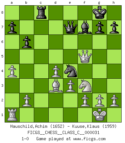 Last move : 1-0 2007 March 28 20:6:18 [Event "FICGS__CHESS__CLASS_C__000031"] [Site "FICGS"] [Date "2007.02.27"] [Round "1"] [White "Hauschild,Achim"] [Black "Kuuse,Klaus"] [Result "1-0"] [WhiteElo "1652"] [BlackElo "1959"] 1.c4 f5 2.d4 Nf6 3.Nc3 e6 4.Bg5 Be7 5.Nf3 O-O 6.e3 c6 7.Bd3 d5 8.O-O Ne4 9.Bxe7 Qxe7 10.Ne2 Bd7 11.Qb3 b6 12.Rfc1 Rc8 13.a4 Be8 14.cxd5 exd5 15.Nf4 Nd7 16.Rxc6 Ndf6 17.Nxd5 Nxd5 18.Rxc8 Rxc8 19.Qxd5+ Bf7 20.Qxf5 1-0 English : Anglo-Dutch defense Kingside Castling by player Black (move 5) Kingside Castling by player White (move 8) Player White won this chess game. Follow this game move after move (download)The game of chess is the touchstone of the intellect. (Goethe) Ich erzeugte keinen Neid, da mich die Schachspieler als Musiker und die Musiker als Schachspieler betrachteten. (Mark Taimanov) Yo siempre he tenido un ligero sentimiento de lástima por una persona que no tiene conocimiento del Ajedrez. (Siegbert Tarrasch) La vie est comme un jeu d'échecs : nous esquissons un plan, mais celui-ci est tributaire de ce que daignent faire l'adversaire aux échecs et le destin dans la vie. (Arthur Schopenhauer) Control your own destiny or someone else will. (Jack Welch)