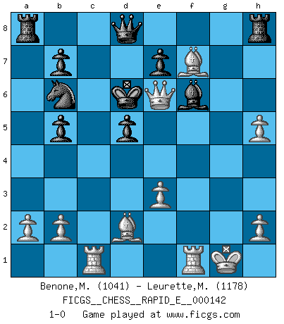 Last move : 1-0 2015 February 5 19:23:35 [Event "FICGS__CHESS__RAPID_E__000142"] [Site "FICGS"] [Date "2015.01.05"] [Round "1"] [White "Benone,Mateia"] [Black "Leurette,Marc-Antoine"] [Result "1-0"] [WhiteElo "1041"] [BlackElo "1178"] 1.Nf3 d5 2.d4 Bg4 3.Ne5 Be6 4.c4 Nf6 5.e3 c6 6.Nc3 Nbd7 7.cxd5 cxd5 8.Bd3 g6 9.O-O Bg7 10.Bd2 Nxe5 11.dxe5 Nd7 12.f4 Nb6 13.Rc1 a6 14.g4 h5 15.f5 Bd7 16.e6 fxe6 17.fxe6 Bxe6 18.Bxg6+ Bf7 19.Bxf7+ Kd7 20.gxh5 Bf6 21.Qg4+ Kd6 22.Nb5+ axb5 23.Qe6+ 1-0 Reti Opening Kingside Castling by player White (move 9) Player White won this chess game. Follow this game move after move (download)Combinations have always been the most intriguing aspect of Chess. The masters look for them, the public applauds them, the critics praise them. It is because combinations are possible that Chess is more than a lifeless mathematical exercise. They are the poetry of the game; they are to Chess what melody is to music. They represent the triumph of mind over matter. (Reuben Fine) Sie führen leise Selbstgespräche, schlürfen lautstark ihre Getränke, schmatzen hörbar beim Essen, blasen ihrem Gegenüber Rauch in die Augen, niesen ihm ins Gesicht, starren ihn unverwandt an, bis er sich unter ihren Blicken windet, rutschen ständig auf ihrem Stuhl hin und her, rülpsen und bohren in der Nase. (Anonymous) Botvinnik trató de alejar el misterio referente al Ajedrez, siempre relacionandolo a situaciones de la vida diaria. Solía llamar al Ajedrez un problema inexacto típico, similar a aquellos en que la gente tiene siempre que resolver a cada día. (Garry Kasparov) Plusieurs personnes se sont demandées comment Tal faisait pour gagner... En fait, c'est très simple ! Il met ses pièces au centre de l'échiquier et les sacrifie quelque part ! (David Bronstein) Live, lose, and learn, by observing your opponent how to win. (Amber Steenbock)