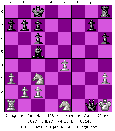 Last move : 0-1 2015 March 1 22:27:28 [Event "FICGS__CHESS__RAPID_E__000142"] [Site "FICGS"] [Date "2015.01.05"] [Round "1"] [White "Stoyanov,Zdravko"] [Black "Puzanov,Vasyl"] [Result "0-1"] [WhiteElo "1161"] [BlackElo "1168"] 1.e4 e5 2.a3 Nc6 3.Bb5 f5 4.Bxc6 dxc6 5.exf5 Bxf5 6.d3 Nf6 7.h3 Bc5 8.Nf3 Qe7 9.O-O O-O-O 10.Re1 e4 11.Bg5 h6 12.dxe4 Rxd1 13.Bxf6 Rxe1+ 14.Nxe1 Qxf6 15.Nc3 Bxh3 16.gxh3 Qxf2+ 17.Kh1 Qg1+ 0-1 Variation Mengarini's Opening : Mengarini's Opening Kingside Castling by player White (move 9) Queenside Castling by player Black (move 9) Player Black won this chess game. Follow this game move after move (download)Chess is a fairy tale of 1001 blunders. (Savielly Tartakower) Im Reiche der Wirklichkeit ist man nie so glücklich wie im Reiche der Gedanken. (Arthur Schopenhauer) Todo lo que importa ante el tablero de Ajedrez son buenas jugadas. (Bobby Fischer) On peut tirer plus d'utilité d'une partie perdue que de 100 parties gagnées. (Capablanca) Macintosh - we might not get everything right, but at least we knew the century was going to end. (Douglas Adams)