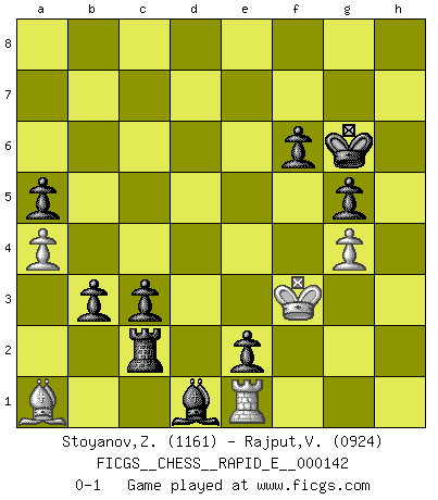 Last move : 0-1 2015 February 4 19:26:2 [Event "FICGS__CHESS__RAPID_E__000142"] [Site "FICGS"] [Date "2015.01.05"] [Round "1"] [White "Stoyanov,Zdravko"] [Black "Rajput,Vishalsingh"] [Result "0-1"] [WhiteElo "1161"] [BlackElo "0924"] 1.e4 e5 2.Nf3 Nc6 3.Bb5 Nge7 4.a3 a6 5.Bxc6 Nxc6 6.Nc3 Be7 7.h3 O-O 8.O-O d6 9.Re1 Re8 10.Nd5 Be6 11.Nxe7+ Qxe7 12.d3 h6 13.c4 Qf6 14.Be3 Qg6 15.Nh4 Qf6 16.Qh5 Ne7 17.Bd2 Kh7 18.Re3 Ng6 19.Nxg6 Qxg6 20.Qxg6+ Kxg6 21.Rg3+ Kh7 22.Ba5 b6 23.Bd2 c6 24.f4 exf4 25.Bxf4 Rad8 26.b3 b5 27.a4 b4 28.e5 d5 29.c5 d4 30.Rb1 a5 31.Kh1 Rf8 32.Rf1 Bxb3 33.Re1 Bc2 34.Ra1 b3 35.Bc1 Rfe8 36.Bb2 Rxe5 37.Rg4 Red5 38.Rg3 Rxc5 39.Rc1 h5 40.Rf3 f6 41.Rcf1 Re5 42.R1f2 Re3 43.Rxe3 dxe3 44.Rf1 Rxd3 45.Re1 Bd1 46.Bc1 e2 47.Kh2 g5 48.g3 Kg6 49.g4 hxg4 50.hxg4 Rc3 51.Bb2 Rc2 52.Ba1 c5 53.Kg3 c4 54.Kf3 c3 0-1 Ruy Lopez : Cozio defense Kingside Castling by player Black (move 7) Kingside Castling by player White (move 8) Player Black won this chess game. Follow this game move after move (download)It is not enough to be a good player... you must also play well. (Siegbert Tarrasch) Wenn Dein Gegner dir ein Remis anbietet, versuch herauszufinden, weshalb er glaubt schlechter zu stehen. (Nigel Short) El Ajedrez es un regaderazo frío para la mente. (Sir John Simon) Des points faibles ou des trous dans la position de l'adversaire doivent être occupés par des pièces et non pas par des pions. (Siegbert Tarrasch) When you don't know what to do, walk fast and look worried. (Anonymous)