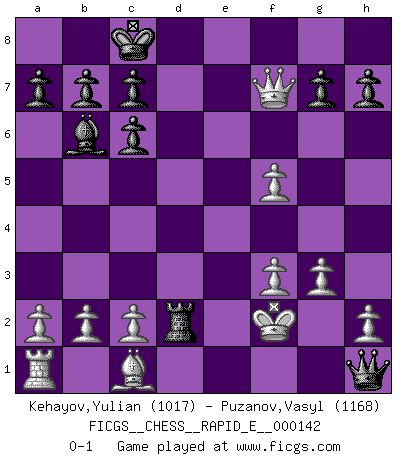Last move : 0-1 2015 March 11 9:6:52 [Event "FICGS__CHESS__RAPID_E__000142"] [Site "FICGS"] [Date "2015.01.05"] [Round "1"] [White "Kehayov,Yulian"] [Black "Puzanov,Vasyl"] [Result "0-1"] [WhiteElo "1017"] [BlackElo "1168"] 1.e4 e5 2.Nf3 Nc6 3.d4 exd4 4.Nxd4 Bc5 5.Nxc6 Qf6 6.f3 dxc6 7.Nd2 Ne7 8.Nb3 Bb6 9.Qe2 Be6 10.Nd2 O-O-O 11.Nc4 Bxc4 12.Qxc4 Rhe8 13.Be2 Nf5 14.exf5 Rd4 15.Qb3 Qh4+ 16.g3 Qh3 17.Qxf7 Rxe2+ 18.Kxe2 Qg2+ 19.Ke1 Qxh1+ 20.Kf2 Rd2+ 0-1 Scotch game Queenside Castling by player Black (move 10) Player Black won this chess game. Follow this game move after move (download)You may learn much more from a game you lose than from a game you win. You will have to lose hundreds of games before becoming a good player. (Jose Raul Capablanca) Wenn du gegen Bobby spielst, ist es keine Frage von gewinnen oder verlieren. Es ist eine Frage des Überlebens. (Boris Vassilievich Spassky) Combinaciones deslumbrantes son para la mayoría, mover madera es para los pocos. (Georg Kieninger) Même un GMI sait rarement calculer sur plus de cinq coups une attaque à sacrifices. (Rudolf Spielmann) There will be no order, only chaos. (Sol Robeson in Pi by Darren Aronofsky)