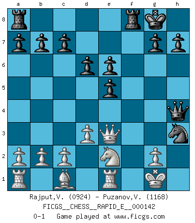 Last move : 0-1 2015 April 5 5:54:52 [Event "FICGS__CHESS__RAPID_E__000142"] [Site "FICGS"] [Date "2015.01.05"] [Round "1"] [White "Rajput,Vishalsingh"] [Black "Puzanov,Vasyl"] [Result "0-1"] [WhiteElo "0924"] [BlackElo "1168"] 1.e4 e5 2.Nf3 Nc6 3.Bc4 Bc5 4.O-O d6 5.h3 Nf6 6.Re1 Be6 7.Bxe6 fxe6 8.Nc3 O-O 9.d3 Nd4 10.Nxd4 Bxd4 11.Ne2 Bxf2+ 12.Kxf2 Nxe4+ 13.Kg1 Nf2 14.Qd2 Qh4 15.Qe3 Nxh3+ 0-1 This chess game has been lost on time (started : 2015.01.05 18:22:4) Giuoco Piano Kingside Castling by player White (move 4) Kingside Castling by player Black (move 8) Player Black won this chess game. Follow this game move after move (download)If your opponent offers you a draw, try to work out why he thinks he's worse off. (Nigel Short) Als er Schachweltmeister wurde ließ er praktisch alle stärksten Sovietspieler für sich arbeiten. Wenn ein auch nur mittelmässiger Meister ein Spezialist für eine bestimmte Eröffnung war, wurde er von Karpov gerufen. Das wurde alles geheim gehalten. (Mikhail Moiseyevich Botvinik) El Ajedrez es un cuento de Hadas de las 1001 metidas de pata. (Savielly Tartakower) La menace est plus forte que l'exécution. (Aaron Nimzovitch) The question of whether computers can think is just like question of whether submarines can swim. (Edsger W. Dijkstra)