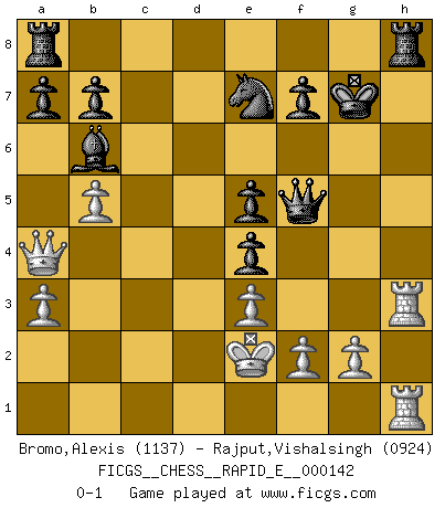 Last move : 0-1 2015 February 7 9:24:25 [Event "FICGS__CHESS__RAPID_E__000142"] [Site "FICGS"] [Date "2015.01.05"] [Round "1"] [White "Bromo,Alexis"] [Black "Rajput,Vishalsingh"] [Result "0-1"] [WhiteElo "1137"] [BlackElo "0924"] 1.d4 d5 2.c4 Bf5 3.Nc3 Nf6 4.h3 h6 5.Nf3 Nc6 6.a3 e6 7.c5 Be7 8.Bf4 Ne4 9.Nxe4 dxe4 10.Ne5 Nxd4 11.Qa4+ c6 12.Nxc6 Nxc6 13.Rd1 Qc8 14.e3 O-O 15.Be2 Bxc5 16.Bg4 Bxg4 17.hxg4 e5 18.Bxh6 gxh6 19.Rxh6 Qxg4 20.Rh3 Qf5 21.b4 Bb6 22.b5 Ne7 23.Ke2 Kg7 24.Rdh1 Rh8 0-1 QGD : Grau (Sahovic) defense Kingside Castling by player Black (move 14) Player Black won this chess game. Follow this game move after move (download)By the beauty of his games, the clarity of his play, and the brilliance of his ideas, Fischer made himself an artist of the same stature as Brahms, Rembrandt, and Shakespeare. (David Levy) Ein Remis kann durch Wiederholung von drei Zügen oder durch einen schlechte Zug erreicht werden. (Savielly Grigorievitsch Tartakower) En la perfecta combinación de Ajedrez como en una historia corta de primera clase, toda la trama y contra trama deberá conducir hacia un final sorprendente, el interes no es mitigado hasta el último momento. (Yates and Winter) On a dit que l'homme se distingue de l'animal par le fait qu'il achète plus de livres qu'il ne peut en lire. Je voudrais suggérer qu'inclure à la liste des livres quelques livres d'échecs rendrait la distinction manifeste. (Edward Lasker) Coffee just isn't my cup of tea. (Unknown)