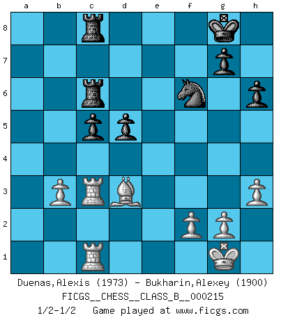 Last move : 1/2-1/2 2015 May 19 19:8:29 [Event "FICGS__CHESS__CLASS_B__000215"] [Site "FICGS"] [Date "2015.01.05"] [Round "1"] [White "Duenas,Alexis"] [Black "Bukharin,Alexey"] [Result "1/2-1/2"] [WhiteElo "1973"] [BlackElo "1900"] 1.d4 d5 2.c4 e6 3.Nc3 Nf6 4.Bg5 Be7 5.e3 O-O 6.Nf3 h6 7.Bh4 b6 8.Bxf6 Bxf6 9.cxd5 exd5 10.Be2 Be6 11.Rc1 c5 12.O-O Qe7 13.dxc5 Bxc3 14.Rxc3 bxc5 15.Qc2 Nd7 16.Bb5 Rfc8 17.Nd4 Nf6 18.Nxe6 fxe6 19.Bd3 Qd6 20.h3 Rc7 21.b3 Rac8 22.Qe2 a5 23.Rfc1 a4 24.e4 Qe5 25.exd5 Qxe2 26.Bxe2 exd5 27.Bd3 axb3 28.axb3 Rc6 1/2-1/2 QGD : Tartakower (Makagonov-Bondarevsky) system Kingside Castling by player Black (move 5) Kingside Castling by player White (move 12) This chess game ended in a draw. Follow this game move after move (download)I have added these principles to the law: get the Knights into action before both Bishops are developed. (Emanuel Lasker) Schach ist ein Reich, wo sich die menschliche Phantasie frei entfalten kann. (David Bronstein) Ciertamente el estado mental actual de Bobby Fischer es una tragedia. Uno de los mas grandes jugadores de Ajedrez del mundo -el orgullo y pena del Ajedrez Americano. (Frank Brady) Les échecs sont un jeu terrible. Si vous n'avez pas le centre, votre adversaire a une position plus libre. Par contre, si vous avez le centre, alors vous avez vraiment quelque chose pour laquelle vous inquiéter ! (Siegbert Tarrasch) Animated gif is worth one mega-word. (Unknown)