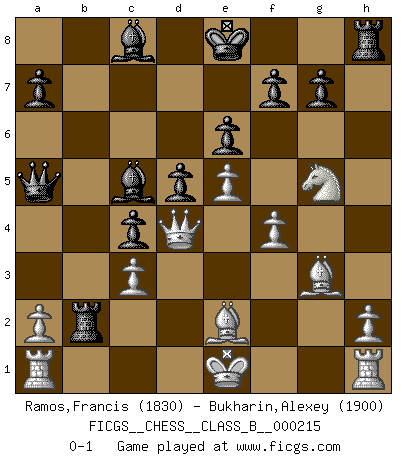 Last move : 0-1 2015 April 11 17:34:13 [Event "FICGS__CHESS__CLASS_B__000215"] [Site "FICGS"] [Date "2015.01.05"] [Round "1"] [White "Ramos,Francis"] [Black "Bukharin,Alexey"] [Result "0-1"] [WhiteElo "1830"] [BlackElo "1900"] 1.e4 c6 2.d4 d5 3.Nc3 b5 4.e5 e6 5.f4 b4 6.Nce2 c5 7.Nf3 Nc6 8.Be3 c4 9.Ng3 h5 10.Ng5 h4 11.Ne2 Nh6 12.c3 Qa5 13.Qd2 Nf5 14.Bf2 Rb8 15.g4 hxg3 16.Nxg3 Nxg3 17.Bxg3 bxc3 18.bxc3 Ba3 19.Be2 Rb2 20.Qe3 Nxd4 21.Qxd4 Bc5 0-1 Caro-Kann : Gurgenidze counter-attack Player Black won this chess game. Follow this game move after move (download)Fischer is under obligation to nobody. (Joseph Platz) Woher wissen wir, daß der Neanderthaler Blindschach gespielt hat? -- Bei Ausgrabungen wurden keine Schachbretter und Figuren gefunden. (Anonymous) Aquellos que dicen que entienden al Ajedrez, no entienden nada. (Robert Hubner) Nous vivons dans un monde échiquéen : chaque jour qui passe est un défi à relever. (Philosophe Sasha) Creativity is allowing yourself to make mistakes. Art is knowing which ones to keep. (Scott Adams)