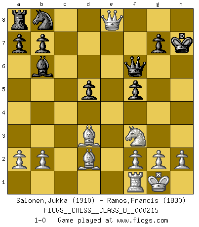 Last move : 1-0 2015 February 1 9:22:31 [Event "FICGS__CHESS__CLASS_B__000215"] [Site "FICGS"] [Date "2015.01.05"] [Round "1"] [White "Salonen,Jukka"] [Black "Ramos,Francis"] [Result "1-0"] [WhiteElo "1910"] [BlackElo "1830"] 1.d4 d5 2.c4 e6 3.Nf3 Nf6 4.Nc3 dxc4 5.e4 Bb4 6.e5 Nd5 7.Bd2 O-O 8.Bxc4 Nb6 9.Bd3 h6 10.Qe2 Nd5 11.O-O c5 12.dxc5 Bxc5 13.Rac1 Bb6 14.Bxh6 f5 15.Nxd5 exd5 16.e6 Qf6 17.e7 Re8 18.Rxc8 Rxc8 19.e8Q+ Rxe8 20.Qxe8+ Kh7 21.Bd2 1-0 Queen's gambit declined Kingside Castling by player Black (move 7) Kingside Castling by player White (move 11) Promotion Queen by player White (move 19) Player White won this chess game. Follow this game move after move (download)It is the aim of the modern school, not to treat every position according to one general law, but according to the principle inherent in the position. (Richard Reti) Alles was ich jemals tun will ist Schach spielen. (Robert James Fischer) Cuando no sepas que mover, espera por una idea que se le venga a la la cabeza de tu oponente. Tenlo por seguro de que esa idea estará incorrecta. (Siegbert Tarrasch) La solitude du joueur d'Echecs à l'approche du mat est semblable à celle du condamné. (Francis Szpiner) If you lose the game you should win the analysis! (Proverb)