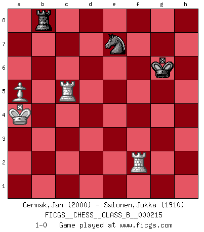 Last move : 1-0 2015 March 6 9:24:35 [Event "FICGS__CHESS__CLASS_B__000215"] [Site "FICGS"] [Date "2015.01.05"] [Round "1"] [White "Cermak,Jan"] [Black "Salonen,Jukka"] [Result "1-0"] [WhiteElo "2000"] [BlackElo "1910"] 1.d4 d5 2.c4 e6 3.Nc3 c6 4.e4 dxe4 5.Nxe4 Bb4+ 6.Bd2 Qxd4 7.Bxb4 Qxe4+ 8.Be2 Na6 9.Ba5 f6 10.Nf3 b6 11.Nd2 Qf4 12.Bh5+ g6 13.Bf3 Ne7 14.Bc3 O-O 15.O-O Qc7 16.Ne4 e5 17.Re1 Nf5 18.Nxf6+ Rxf6 19.Bxe5 Qe7 20.Bxf6 Qxf6 21.Re8+ Kg7 22.Qd2 Nd6 23.Bxc6 Rb8 24.R8e1 Bf5 25.Rad1 Nxc4 26.Qd4 Qxd4 27.Rxd4 Nxb2 28.Re7+ Kf6 29.Re2 Nd3 30.g4 Bxg4 31.Rxg4 Ne5 32.Rd4 Nxc6 33.Rd6+ Kf7 34.Rxc6 Rd8 35.h4 Rd7 36.h5 Nb4 37.hxg6+ hxg6 38.Rc4 a5 39.a3 Nd5 40.Rc6 Nf4 41.Re4 Rd1+ 42.Kh2 Nd5 43.a4 Rf1 44.Kg2 Rd1 45.Rh4 Kg7 46.Kf3 Rd3+ 47.Ke4 Rd2 48.Ke5 Nb4 49.Rc7+ Kg8 50.f3 Rd5+ 51.Ke6 Rd3 52.Rg4 Re3+ 53.Kd6 Rxf3 54.Rxg6+ Kf8 55.Ke5 Re3+ 56.Kd4 Rd3+ 57.Kc4 Rd8 58.Rf6+ Kg8 59.Rxb6 Nd5 60.Rg6+ Kf8 61.Rc5 Ne7 62.Rf6+ Kg7 63.Rf2 Kh6 64.Rxa5 Rc8+ 65.Rc5 Ra8 66.a5 Kg6 67.Kb5 Rb8+ 68.Ka4 1-0 QGD : Semi-Slav, Marshall gambit Kingside Castling by player Black (move 14) Kingside Castling by player White (move 15) 10 pieces endgame at move 53 : White KRRP , Black KRNPPP WHITE : King + 2 Rooks 1 Pawn BLACK : King + 1 Rook 1 Knight 3 Pawns 9 pieces endgame at move 54 : White KRRP , Black KRNPP WHITE : King + 2 Rooks 1 Pawn BLACK : King + 1 Rook 1 Knight 2 Pawns 8 pieces endgame at move 59 : White KRRP , Black KRNP WHITE : King + 2 Rooks 1 Pawn BLACK : King + 1 Rook 1 Knight 1 Pawn 7 pieces endgame at move 64 : White KRRP , Black KRN WHITE : King + 2 Rooks 1 Pawn BLACK : King + 1 Rook 1 Knight Player White won this chess game. Follow this game move after move (download)Chess is a terrible game. If you have no center, your opponent has a freer position. If you do have a center, then you really have something to worry about ! (Siegbert Tarrasch) Die meiste Zeit treffe ich auf Gegner, die meine Enkel sein könnten. Ich bin da, um ihnen zu zeigen, dass sie von mir noch einiges lernen können. (Viktor Kortschnoi) Combinaciones deslumbrantes son para la mayoría, mover madera es para los pocos. (Georg Kieninger) D'abord les bases : Jouez et étudiez, puis étudiez et jouez, ensuite jouez et étudiez, puis étudiez et jouez. Deuxièmement : Donnez toujours le meilleur de vous-même ! (Ken Smith) Methinks King Thibault should dub Marius Zubac a knight of the square board... I mean table, henceforth addressing him as Sir Marius, and bestow on him a suitable land from the kingdom of FICGS & marry him off to a worthy, fair maiden, lest he slice our heads with his mighty sword in his wrath. (Dinesh De Silva)