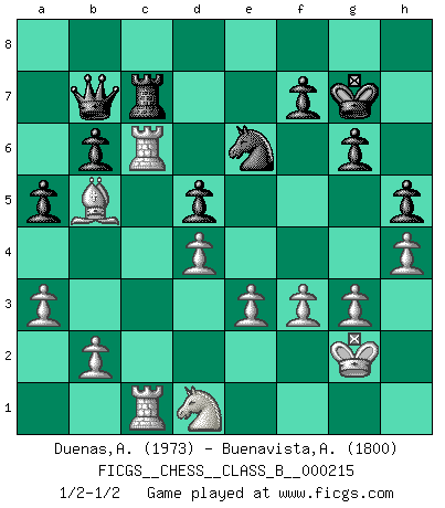 Last move : 1/2-1/2 2015 February 24 12:59:30 [Event "FICGS__CHESS__CLASS_B__000215"] [Site "FICGS"] [Date "2015.01.05"] [Round "1"] [White "Duenas,Alexis"] [Black "Buenavista,Anthony"] [Result "1/2-1/2"] [WhiteElo "1973"] [BlackElo "1800"] 1.d4 Nf6 2.c4 e6 3.Nc3 Bb4 4.Qc2 O-O 5.a3 Bxc3+ 6.Qxc3 b6 7.Bg5 Bb7 8.f3 h6 9.Bh4 d5 10.e3 a5 11.Rc1 Na6 12.cxd5 exd5 13.Nh3 Re8 14.Nf2 Qd6 15.Be2 Qe6 16.Bxf6 Qxf6 17.O-O Qe6 18.Bb5 c6 19.Bxc6 Rec8 20.Bxb7 Rxc3 21.Rxc3 Ra7 22.Bc6 Nc7 23.Re1 Qd6 24.Rec1 Qe7 25.Re1 Ne6 26.Rec1 Rc7 27.g3 Qd6 28.Bb5 h5 29.Kg2 Qe7 30.Bc6 Qd8 31.h4 g6 32.Bb5 Kg7 33.Nd1 Qc8 34.Rc6 Qb7 1/2-1/2 Nimzo-Indian : Classical variation Kingside Castling by player Black (move 4) Kingside Castling by player White (move 17) This chess game ended in a draw. Follow this game move after move (download)One bad move nullifies forty good ones. (Horowitz) Wenn du nicht weißt was du tun sollst, warte bis dein Gegner eine Idee hat. Sie wird sicher schlecht sein. (Siegbert Tarrasch) En la vida, como en el Ajedrez, los Peones propios obstruyen nuestro camino. La gran fortuna de un hombre, su comodidad, placer, hijos, libros, que deberían ayudarle a ganar, con mucha frecuencia lo ponen en Jaque Mate. (Charles Buxton) Les échecs, c'est l'art d'analyser. (Mikhail Botvinnik) Chess is as much a mystery as women. (Purdy)