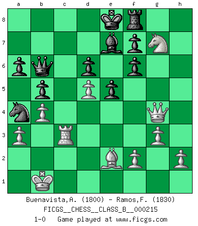 Last move : 1-0 2015 March 19 17:50:58 [Event "FICGS__CHESS__CLASS_B__000215"] [Site "FICGS"] [Date "2015.01.05"] [Round "1"] [White "Buenavista,Anthony"] [Black "Ramos,Francis"] [Result "1-0"] [WhiteElo "1800"] [BlackElo "1830"] 1.e4 c5 2.Nf3 d6 3.d4 cxd4 4.Qxd4 a6 5.Be3 Nc6 6.Qd2 Nf6 7.Nc3 e6 8.O-O-O Be7 9.Bf4 e5 10.Bg5 Be6 11.Bxf6 gxf6 12.Nd5 Bxd5 13.exd5 Nb8 14.Nh4 Nd7 15.Be2 Rc8 16.Nf5 Rg8 17.g3 b5 18.Qh6 Qc7 19.c3 Qa5 20.a3 Rxc3+ 21.Kb1 Rc7 22.Rc1 Nc5 23.Qxh7 Rf8 24.Qh4 Na4 25.Rxc7 Qxc7 26.Rc1 Qa5 27.Qg4 Nc5 28.Rc3 Qb6 29.b4 Na4 30.Ng7+ 1-0 Sicilian, Chekhover variation Queenside Castling by player White (move 8) Player White won this chess game. Follow this game move after move (download)Pawn endings are to Chess what putting is to golf. (Cecil Purdy) Wenn es im Universum noch irgendwo intelligente Lebewesen gibt, dann kennen sie Go. (Emanuel Lasker) El muchacho (en ese entonces un niño de 12 años llamado Anatoly Karpov) no tiene ni idea de lo que es el Ajedrez y no hay futuro en absoluto para el en esta profesión. (Mikhail Botvinnik) Mais l'homme est une créature légère et illogique : semblable au joueur d'échecs, il n'aime que le processus du but à atteindre, non le but lui-même. (Dostoïevsky) I just play for fun. (Anna Kournikova)